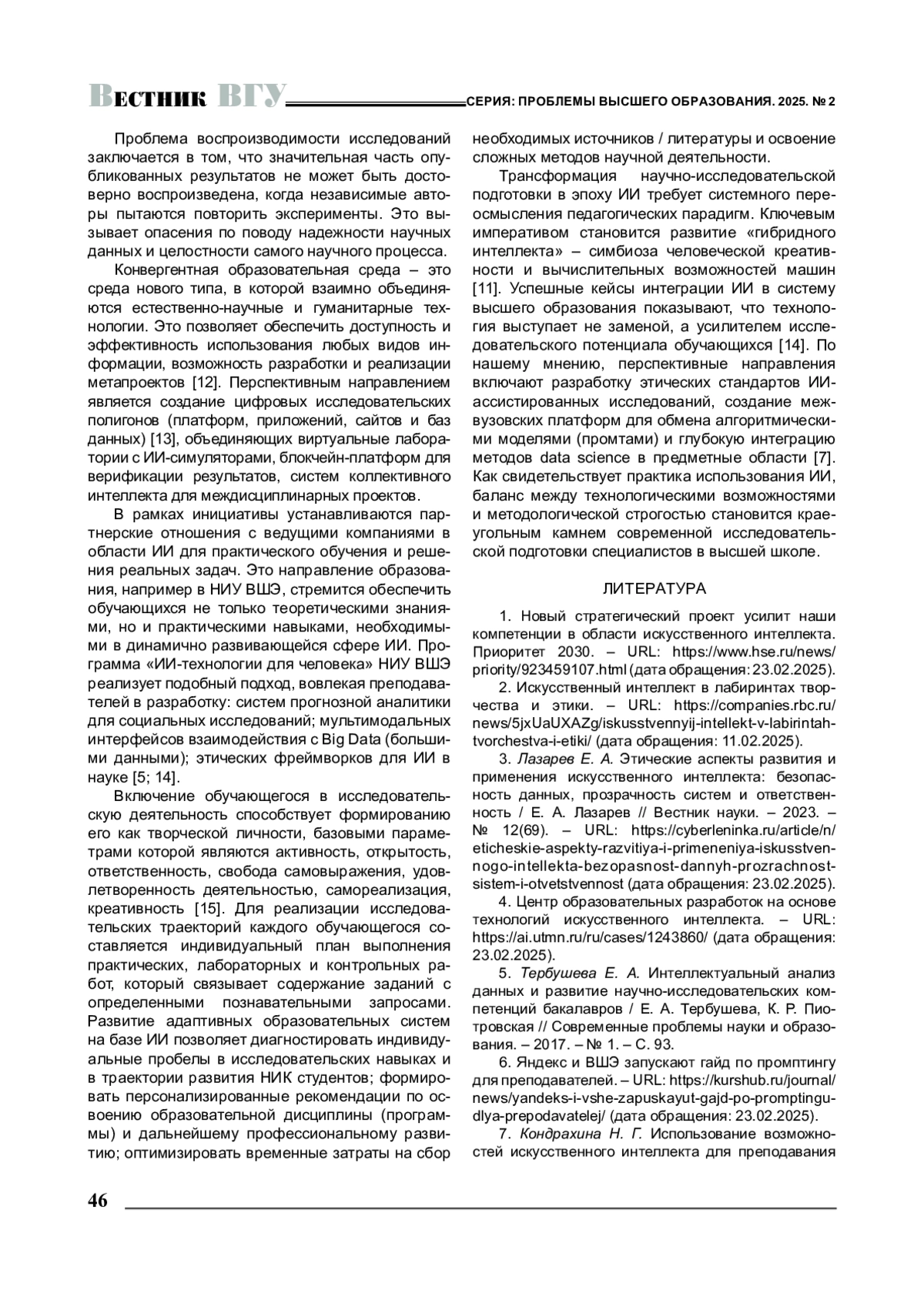 7. Кондрахина Н. Г Использование возможностей искусственного интеллекта для преподавания иностранных языков: новая реальность / Н. Г. Кондрахина, О. Н. Петрова // МНКО. - 2024. - № 1(104). -URL: https://cyberleninka.ru/article/n/ispolzovanie-voz-mozhnostey-iskusstvennogo- intellekta-dlya-prepodava-niya-inostrannyh-yazykov-novaya-realnost (дата обращения: 23.02.2025).