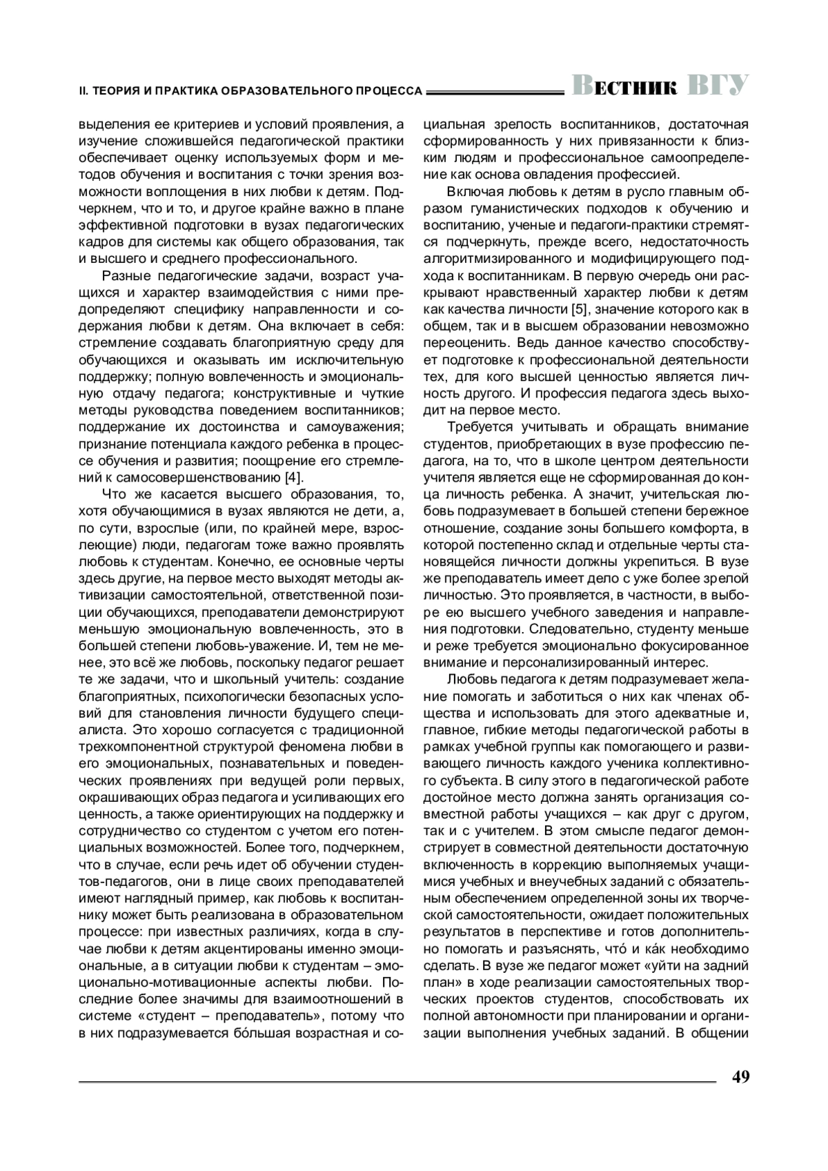Требуется учитывать и обращать внимание студентов, приобретающих в вузе профессию педагога, на то, что в школе центром деятельности учителя является еще не сформированная до конца личность ребенка. А значит, учительская любовь подразумевает в большей степени бережное отношение, создание зоны большего комфорта, в которой постепенно склад и отдельные черты становящейся личности должны укрепиться. В вузе же преподаватель имеет дело с уже более зрелой личностью. Это проявляется, в частности, в выборе ею высшего учебного заведения и направления подготовки. Следовательно, студенту меньше и реже требуется эмоционально фокусированное внимание и персонализированный интерес.