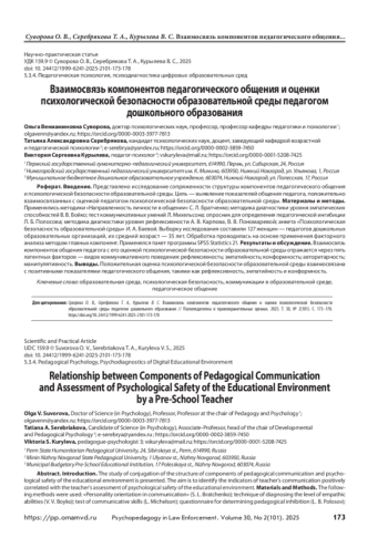 8. Иванова Н. В., Суворова О. В., Минаева Е. В. Психологическая безопасность образовательной среды с позиции родителей младших школьников // Сибирский психологический журнал. 2024. № 91. С. 118–138.