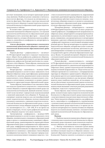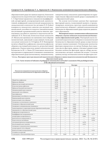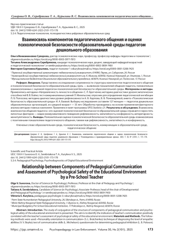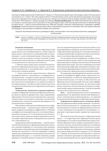 Представлено исследование сопряженности структуры компонентов педагогического общения и психологической безопасности образовательной среды. Цель — выявление показателей общения педагога, положительно взаимосвязанных с оценкой педагогом психологической безопасности образовательной среды. Материалы и методы. Применялись методики «Направленность личности в общении» С. Л. Братченко; методика диагностики уровня эмпатических способностей В. В. Бойко; тест коммуникативных умений Л. Михельсона; опросник для определения педагогической ингибиции Л. Б. Полосова; методика диагностики уровня рефлексивности А. В. Карпова, В. В. Пономаревой; анкета «Психологическая безопасность образовательной среды» И. А. Баевой. Выборку исследования составили 127 женщин — педагогов дошкольных образовательных организаций, их средний возраст — 35 лет. Обработка проводилась на основе применения факторного анализа методом главных компонент. Применялся пакет программы SPSS Statistics 21. Результаты и обсуждение. Взаимосвязь компонентов общения педагога с его оценкой психологической безопасности образовательной среды отражается через пять латентных факторов — видов коммуникативного поведения: рефлексивность; эмпатийность; конформность; авторитарность; манипулятивность. Выводы. Положительная оценка психологической безопасности образовательной среды взаимосвязана с позитивными показателями педагогического общения, такими как рефлексивность, эмпатийность и конформность.