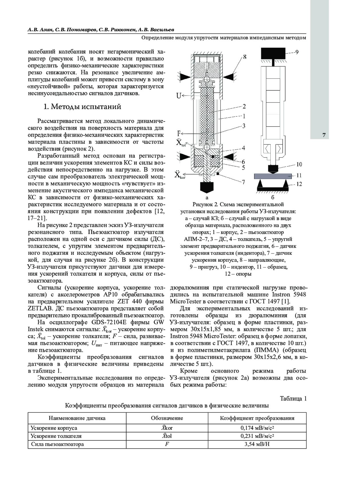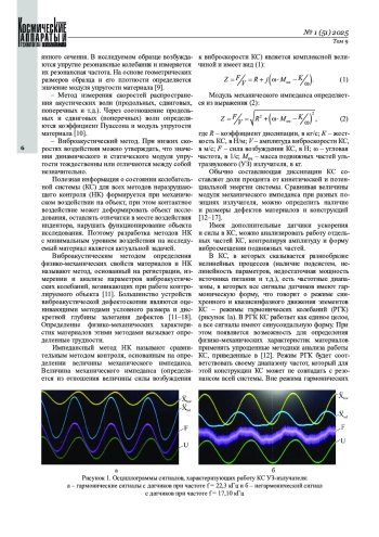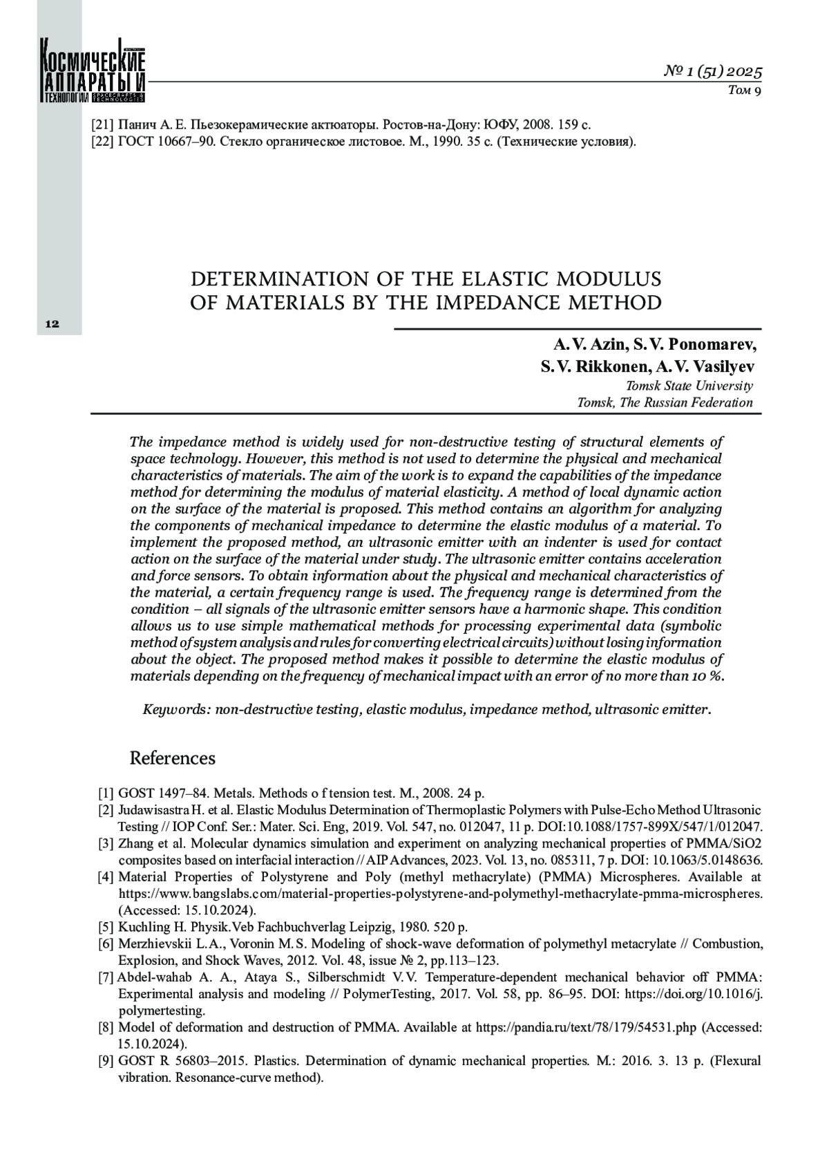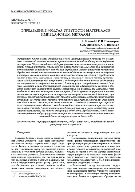 Эффективно применяемый импедансный метод неразрушающего контроля для элементов космической техники является сравнительным методом обнаружения дефектов материалов. Однако определение деформационных характеристик материалов, в частности модуля упругости, этим методом затруднительно. Цель работы: расширение возможностей импедансного метода для определения модуля упругости материала. Предложен метод локального динамического воздействия на поверхность материала, в котором возможен анализ составляющих механического импеданса с определением модуля упругости материала. Устройство, реализующее данный метод, представляет собой ультразвуковой излучатель с индентором для контактного воздействия на поверхность исследуемого материала. В конструкцию устройства включены датчики ускорения и силы. Ультразвуковой излучатель при одностороннем доступе к объекту оказывает минимальное силовое воздействие на исследуемый материал, что особенно важно при неразрушающем контроле. Для получения информации о физико-механических характеристиках материала используется частотный диапазон, при котором все сигналы датчиков имеют гармоническую форму. В режиме гармонических колебаний колебательная система «устройство-исследуемый материал» работает как единое целое. Наличие режима гармонических колебаний позволяет при обработке экспериментальных данных о колебательной системе использовать простые математические методы (символический метод анализа систем и правила преобразования электрических цепей) без потери информации об объекте. Предложенный метод позволяет определять модуль упругости материалов в зависимости от частоты механического воздействия с погрешностью не более 10 %.