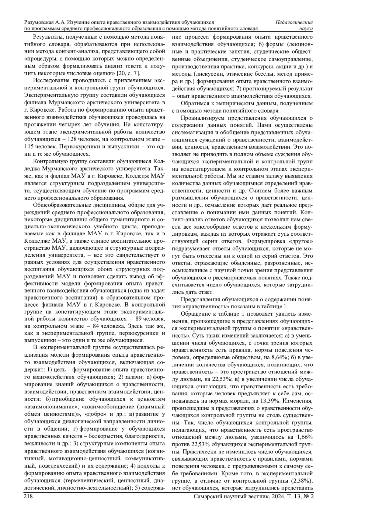 В статье актуализируется проблема нравственного воспитания современной российской молодежи, одним из аспектов которой является формирование у обучающихся опыта нравственного взаимодействия с другими людьми. Выявляются научные предпосылки для эффективного решения проблемы формирования опыта нравственного взаимодействия обучающихся с людьми в условиях учреждения среднего профессионального образования. Предлагается структура опыта нравственного взаимодействия, образуемая когнитивным, мотивационно-ценностным, коммуникативным и поведенческим компонентами. Определяются возможности метода понятийного словаря в изучении сформированности у обучающихся в учреждении среднего профессионального образования когнитивного компонента опыта нравственного взаимодействия, содержание которого (компонента) образуют знания о нравственности, о взаимодействии, о нравственном взаимодействии, о ценности. Обосновывается выбор экспериментальной и контрольной групп. Сравниваются результаты, полученные с помощью метода понятийного словаря как метода научно-педагогического исследования при изучении знаний о понятиях «нравственность», «взаимодействие», «нравственное взаимодействие», «ценность», имеющихся у обучающихся первого и выпускного курсов экспериментальной и контрольной групп, и представляются изменения, произошедшие в содержании знаний обучающихся. Обосновывается вывод об эффективности экспериментальной работы по формированию опыта нравственного взаимодействия обучающихся по программам среднего профессионального образования.
