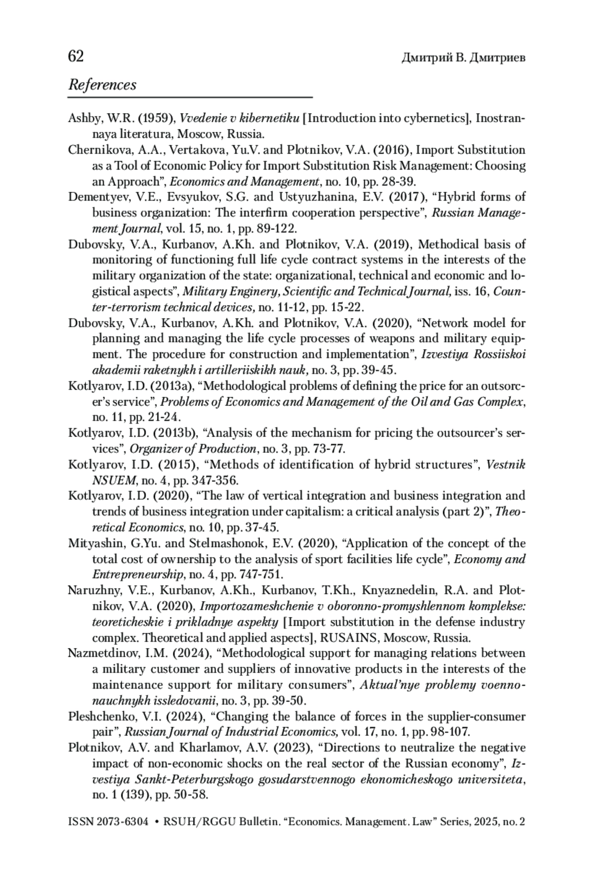 3. Дубовский и др. 2019 - Дубовский В.А., Курбанов А.Х., Плотников В.А. Методическая основа мониторинга функционирования системы контрактов полного жизненного цикла в интересах военной организации государства: организационные, технико-экономические и логистические аспекты // Вопросы оборонной техники. Серия 16: Технические средства противодействия терроризму. 2019. № 11-12. С. 15-22.