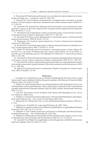 2. Дудко Г. Н. Казуальное толкование как неотъемлемый элемент реализации права // Социальные институты в правовом измерении: теория и практика: матер. V Междунар. науч.-практ. конф. (Иркутск, 20 апреля 2023 г.). Иркутск: Иркут. гос. ун-т, 2023. С. 17-22. EDN: ZXSDAA