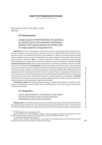 Статья: СОЦИАЛЬНАЯ ОТВЕТСТВЕННОСТЬ БИЗНЕСА В АСПЕКТЕ КОНСТИТУЦИОННО-ПРАВОВЫХ ЦЕННОСТЕЙ СОЦИАЛЬНОГО ПАРТНЕРСТВА И СОЦИАЛЬНОЙ СОЛИДАРНОСТИ (2025)