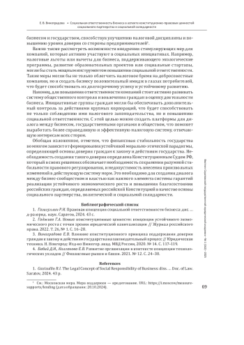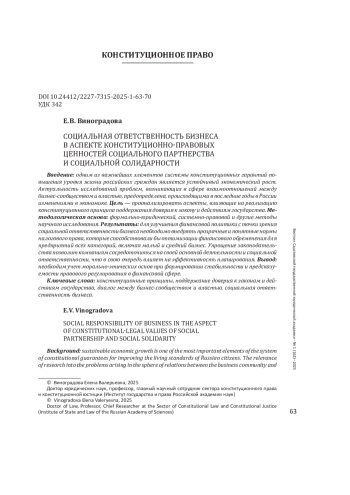 ВИНОГРАДОВА Е. В. СОЦИАЛЬНАЯ ОТВЕТСТВЕННОСТЬ БИЗНЕСА В АСПЕКТЕ КОНСТИТУЦИОННО-ПРАВОВЫХ ЦЕННОСТЕЙ СОЦИАЛЬНОГО ПАРТНЕРСТВА И СОЦИАЛЬНОЙ СОЛИДАРНОСТИ // ВЕСТНИК САРАТОВСКОЙ ГОСУДАРСТВЕННОЙ ЮРИДИЧЕСКОЙ АКАДЕМИИ. 2025. № 1 (162)