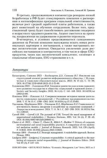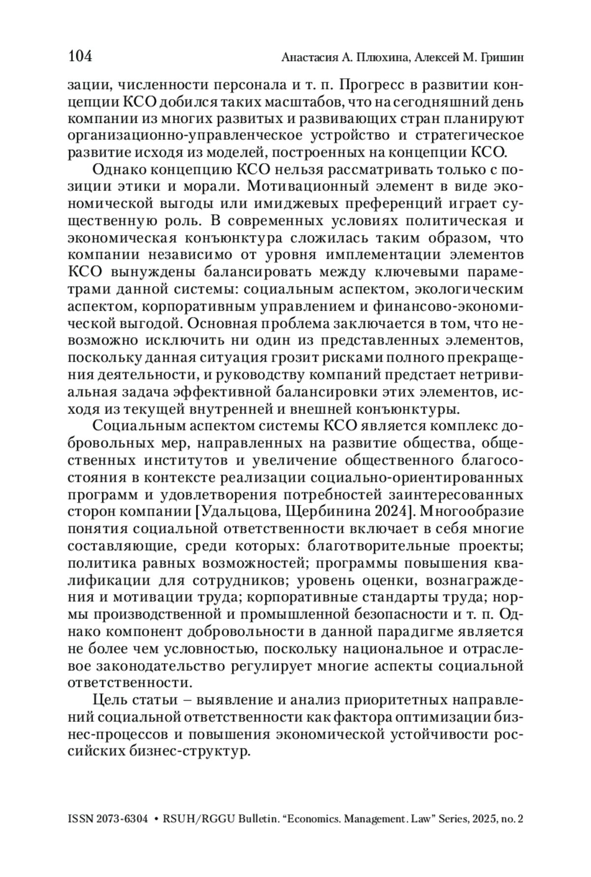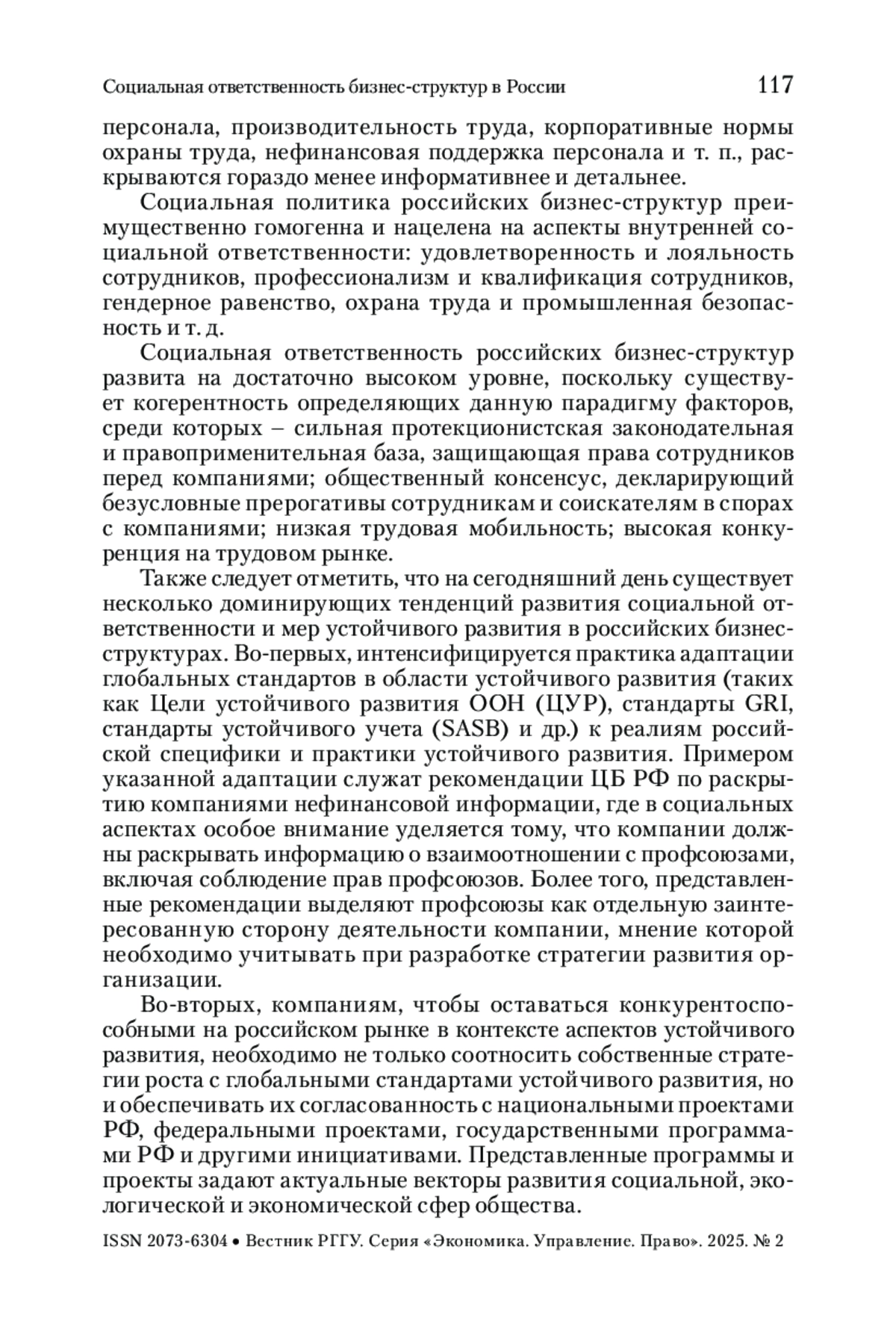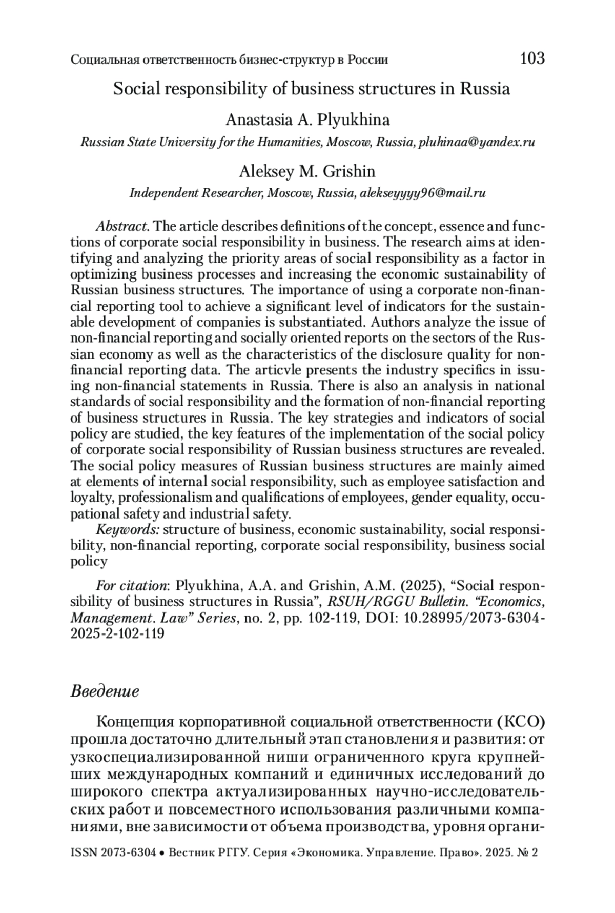 ПЛЮХИНА А. А., ГРИШИН А. М. СОЦИАЛЬНАЯ ОТВЕТСТВЕННОСТЬ БИЗНЕС-СТРУКТУР В РОССИИ // ВЕСТНИК РГГУ. СЕРИЯ: ЭКОНОМИКА. УПРАВЛЕНИЕ. ПРАВО. 2025. № 2
