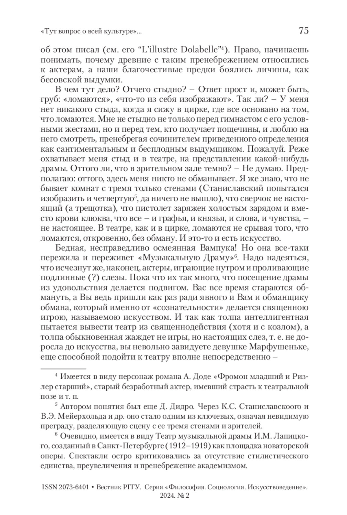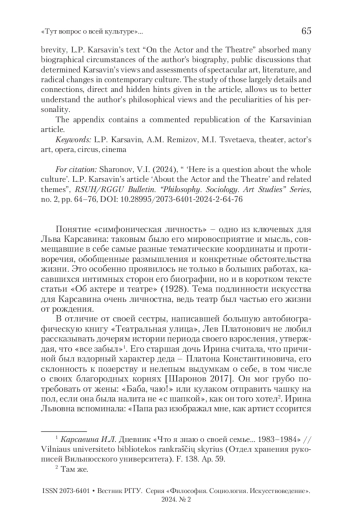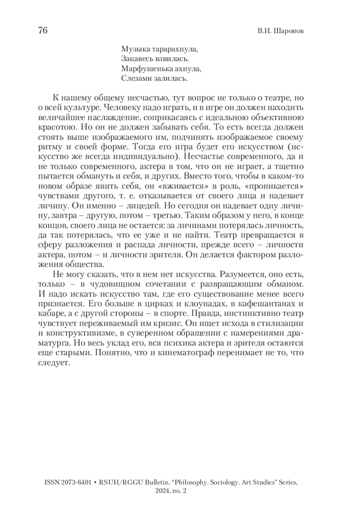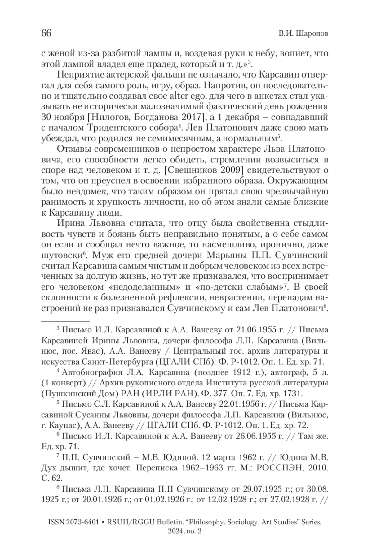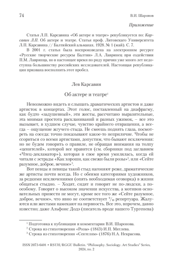 ШАРОНОВ В. И. «ТУТ ВОПРОС О ВСЕЙ КУЛЬТУРЕ». СТАТЬЯ Л. П. КАРСАВИНА «ОБ АКТЕРЕ И ТЕАТРЕ» И СОПУТСТВУЮЩИЕ ЕЙ ТЕМЫ // ВЕСТНИК РГГУ. СЕРИЯ: ФИЛОСОФИЯ. СОЦИОЛОГИЯ. ИСКУССТВОВЕДЕНИЕ. 2024. № 2