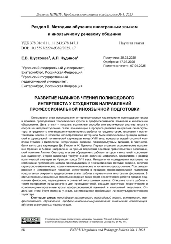 ШУСТРОВА Е. В., ЧУДИНОВ А. П. РАЗВИТИЕ НАВЫКОВ ЧТЕНИЯ ПОЛИКОДОВОГО ИНТЕРТЕКСТА У СТУДЕНТОВ НАПРАВЛЕНИЙ ПРОФЕССИОНАЛЬНОЙ ИНОЯЗЫЧНОЙ ПОДГОТОВКИ // ВЕСТНИК ПЕРМСКОГО НАЦИОНАЛЬНОГО ИССЛЕДОВАТЕЛЬСКОГО ПОЛИТЕХНИЧЕСКОГО УНИВЕРСИТЕТА. ПРОБЛЕМЫ ЯЗЫКОЗНАНИЯ И ПЕДАГОГИКИ. 2025. № 1