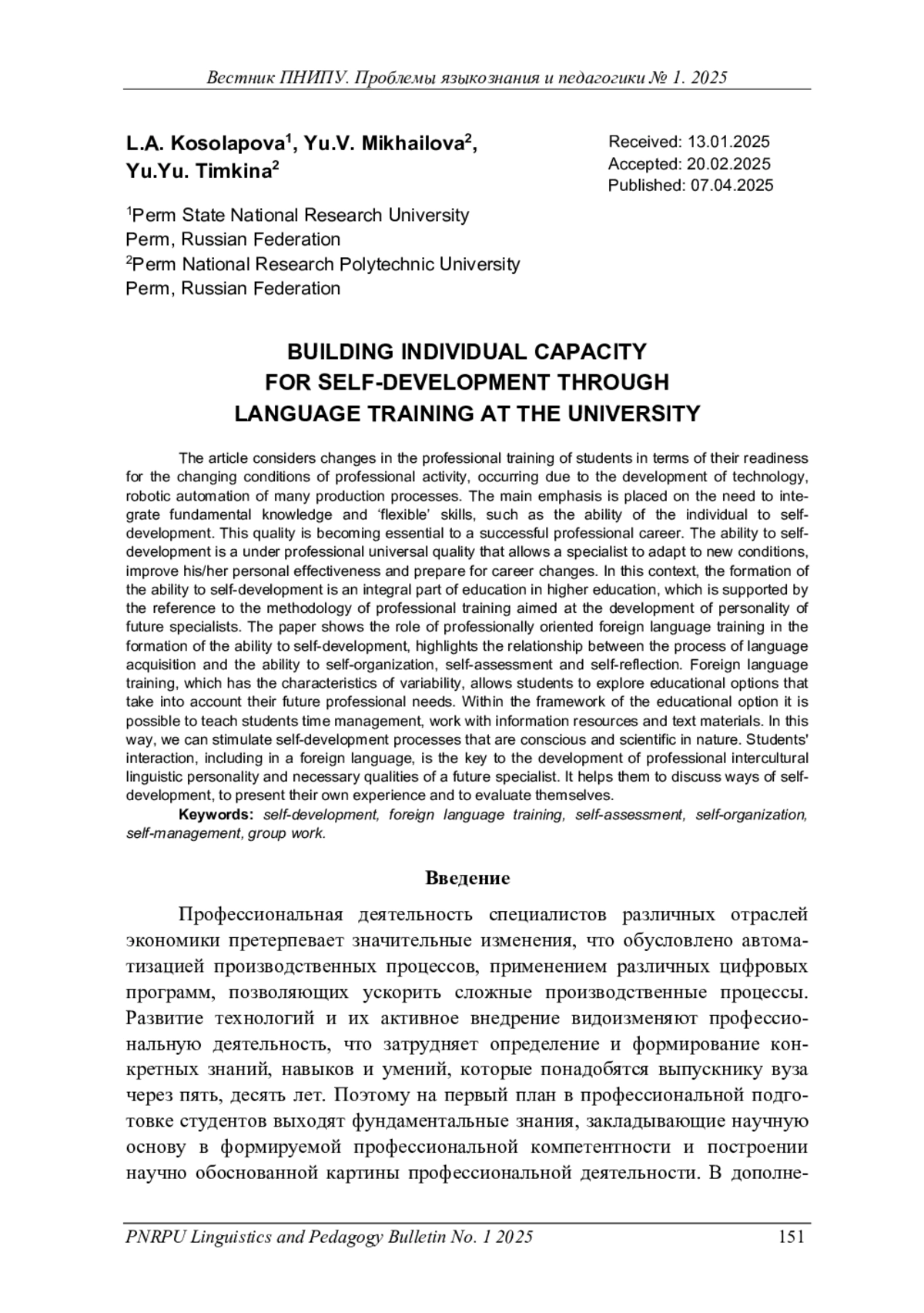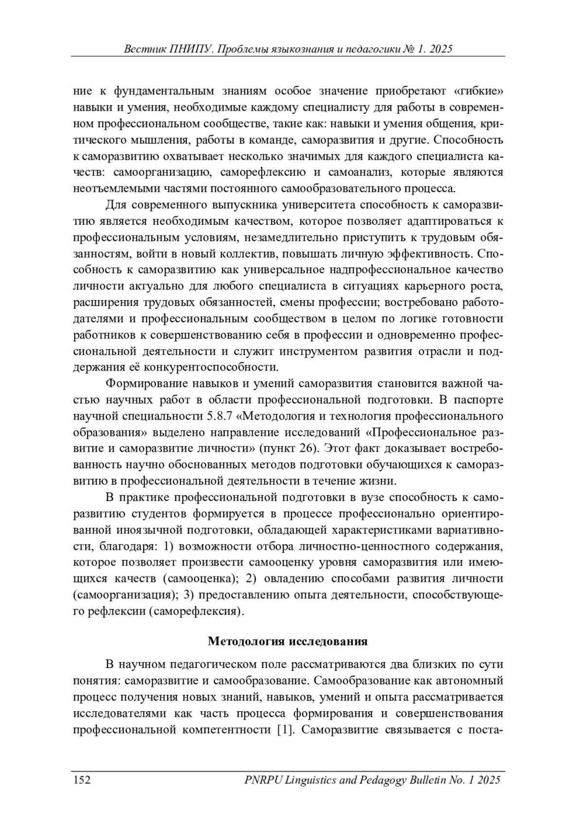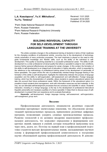 Рассматриваются изменения в профессиональной подготовке студентов и их готовности к изменяющимся условиям профессиональной деятельности, происходящим благодаря развитию современных технологий, роботизации и автоматизации многих производственных процессов. Основной акцент делается на необходимости интеграции фундаментальных знаний и способности личности к саморазвитию. Это качество становится ключевым для успешной профессиональной карьеры. Способность к саморазвитию – надпрофессиональное универсальное качество, позволяющее специалисту адаптироваться к новым условиям, повышать свою личную эффективность и готовиться к карьерным изменениям. В этом контексте формирование способности к саморазвитию является неотъемлемой частью образования в вузе, что подкрепляется обращением к методологии профессиональной подготовки, направленной на развитие личности будущих специалистов. В работе показана роль профессионально ориентированного обучения иностранному языку в формировании способности к саморазвитию, выделена взаимосвязь между процессами овладения языком и способностями к самоорганизации, самооценке и саморефлексии. Иноязычная подготовка, обладающая характеристиками вариативности, позволяет студентам изучать образовательные варианты, учитывающие их будущие профессиональные потребности. В рамках образовательного варианта возможно научить студентов тайм-менеджменту, работе с информационными ресурсами и с текстовыми материалами. Таким образом, мы можем стимулировать процессы саморазвития, которые носят осознанный характер. Взаимодействие студентов, в том числе на иностранном языке, – ключ к развитию необходимых качеств будущего специалиста. Межличностное взаимодействие в группах, организуемое на занятиях по иностранному языку, помогает студентам обсуждать пути саморазвития, представлять свой собственный опыт и оценивать себя.