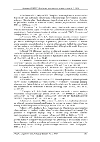 11. Вахрушева, О.В. Теоретические основы формирования самоорганизации при обучении иностранному языку в военном вузе / О.В. Вахрушева // Вестник Пермского национального исследовательского политехнического университета. Проблемы языкознания и педагогики. - 2023. - № 1. - С. 187-198.