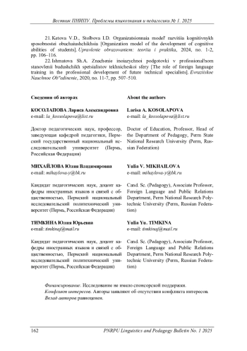 8. Перчаткина, В.Г. Модель социально-профессионального саморазвития студентов инженерного вуза в процессе иноязычной подготовки и технология ее реализации / В.Г. Перчаткина // Вестник Нижегород. ун-та им. Н.И. Лобачевского. Сер.: Социальные науки. - 2023. - №3 (71). - С. 219-223. EDN: FAGXGW