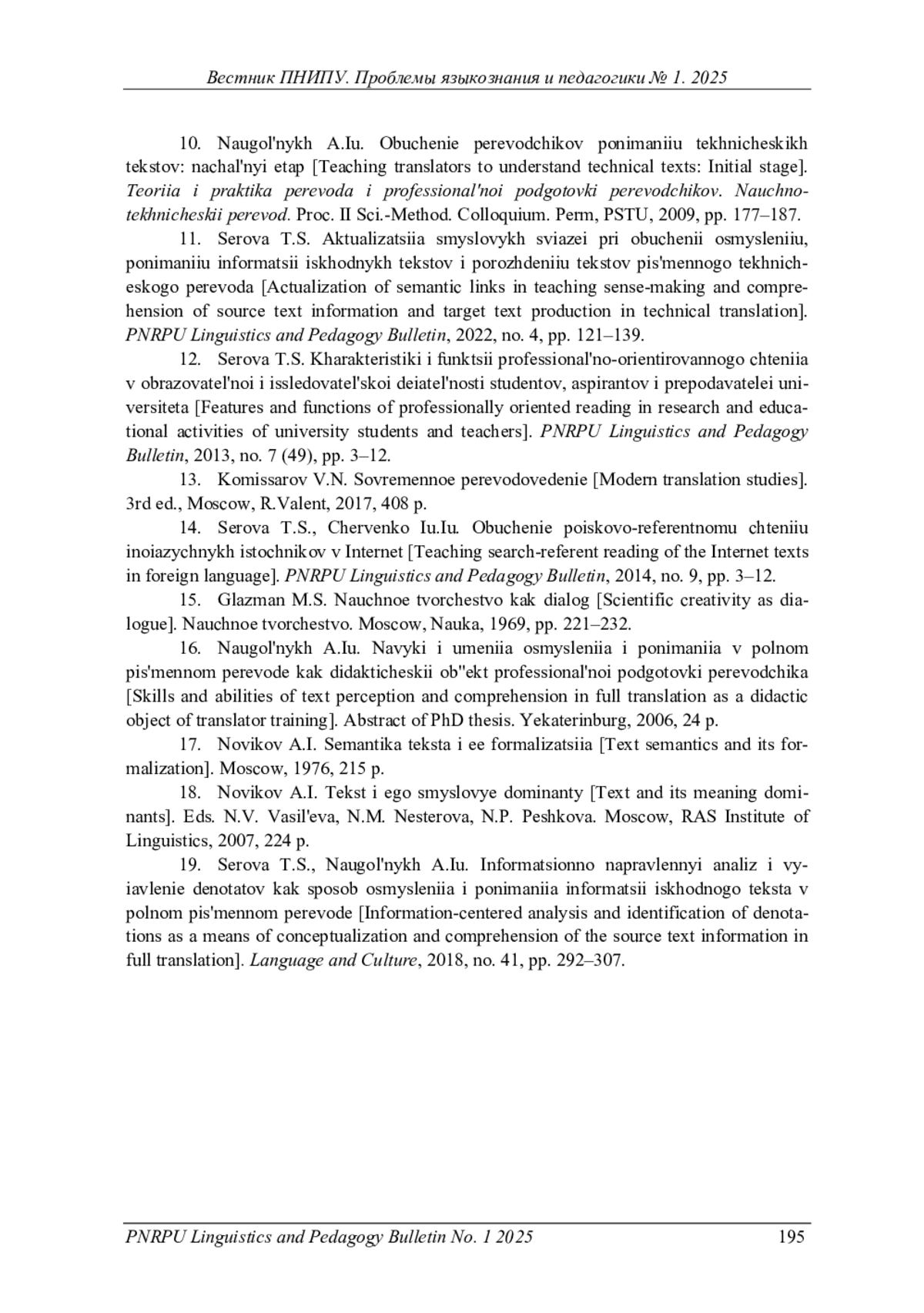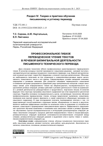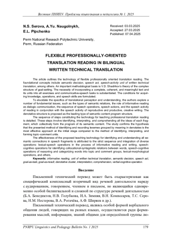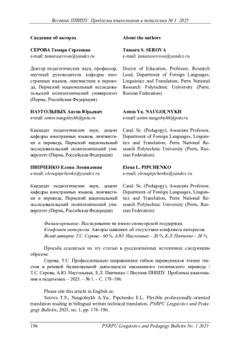 СЕРОВА Т. С., НАУГОЛЬНЫХ А. Ю., ПИПЧЕНКО Е. Л. ПРОФЕССИОНАЛЬНОЕ ГИБКОЕ ПЕРЕВОДЧЕСКОЕ ЧТЕНИЕ ТЕКСТОВ В РЕЧЕВОЙ БИЛИНГВАЛЬНОЙ ДЕЯТЕЛЬНОСТИ ПИСЬМЕННОГО ТЕХНИЧЕСКОГО ПЕРЕВОДА // ВЕСТНИК ПЕРМСКОГО НАЦИОНАЛЬНОГО ИССЛЕДОВАТЕЛЬСКОГО ПОЛИТЕХНИЧЕСКОГО УНИВЕРСИТЕТА. ПРОБЛЕМЫ ЯЗЫКОЗНАНИЯ И ПЕДАГОГИКИ. 2025. № 1