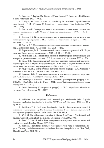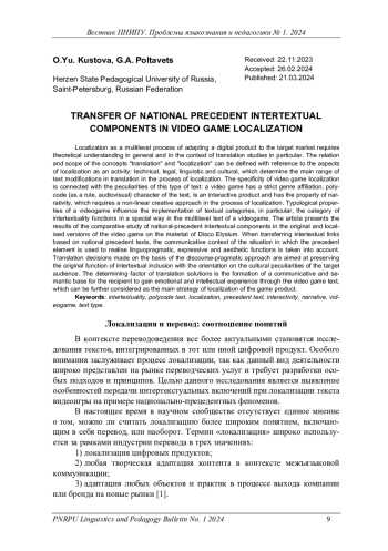 Статья: ПЕРЕДАЧА НАЦИОНАЛЬНО-ПРЕЦЕДЕНТНЫХ ИНТЕРТЕКСТУАЛЬНЫХ КОМПОНЕНТОВ ПРИ ЛОКАЛИЗАЦИИ ВИДЕОИГР (2024)