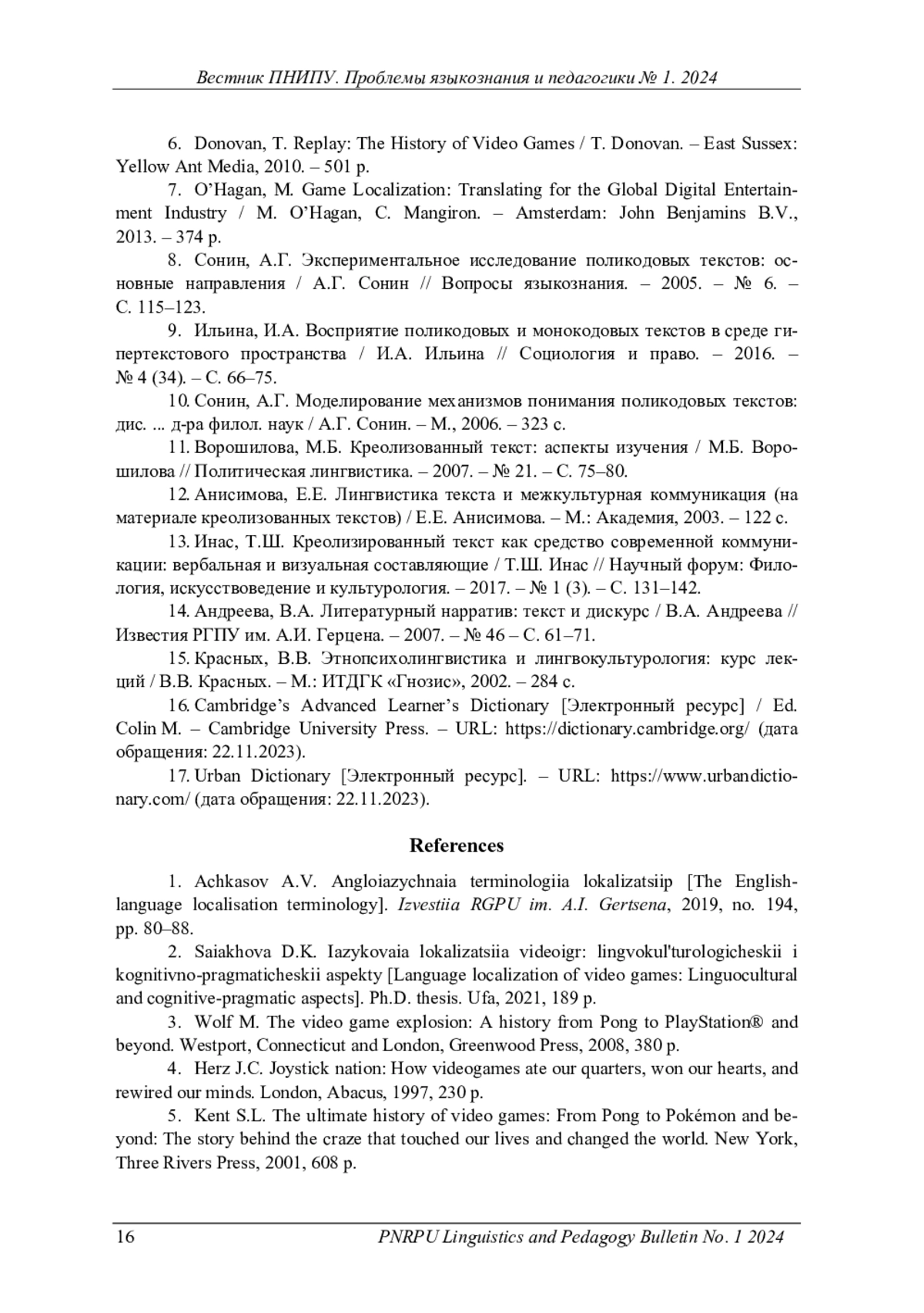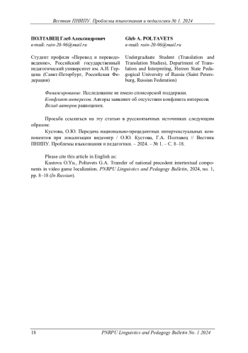 КУСТОВА О. Ю., ПОЛТАВЕЦ Г. А. ПЕРЕДАЧА НАЦИОНАЛЬНО-ПРЕЦЕДЕНТНЫХ ИНТЕРТЕКСТУАЛЬНЫХ КОМПОНЕНТОВ ПРИ ЛОКАЛИЗАЦИИ ВИДЕОИГР // ВЕСТНИК ПЕРМСКОГО НАЦИОНАЛЬНОГО ИССЛЕДОВАТЕЛЬСКОГО ПОЛИТЕХНИЧЕСКОГО УНИВЕРСИТЕТА. ПРОБЛЕМЫ ЯЗЫКОЗНАНИЯ И ПЕДАГОГИКИ. 2024. № 1