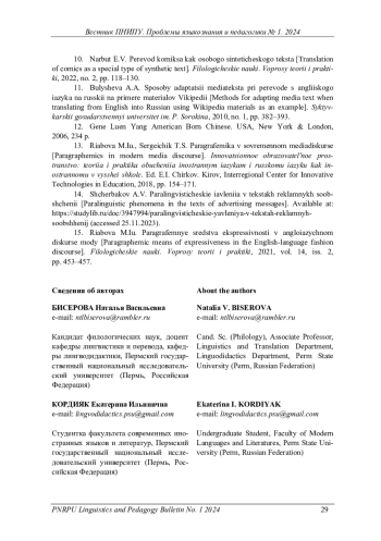13. Рябова, М.Ю. Параграфемика в современном медиадискурсе / М.Ю. Рябова, Т.С. Сергейчик // Инновационное образовательное пространство: теория и практика обучения иностранным языкам и русскому языку как иностранному в высшей школе: коллективная монография / под ред. Е.И. Чирковой. - Киров: Изд-во МЦИТО, 2018. - С. 154-171. EDN: IQYSQU