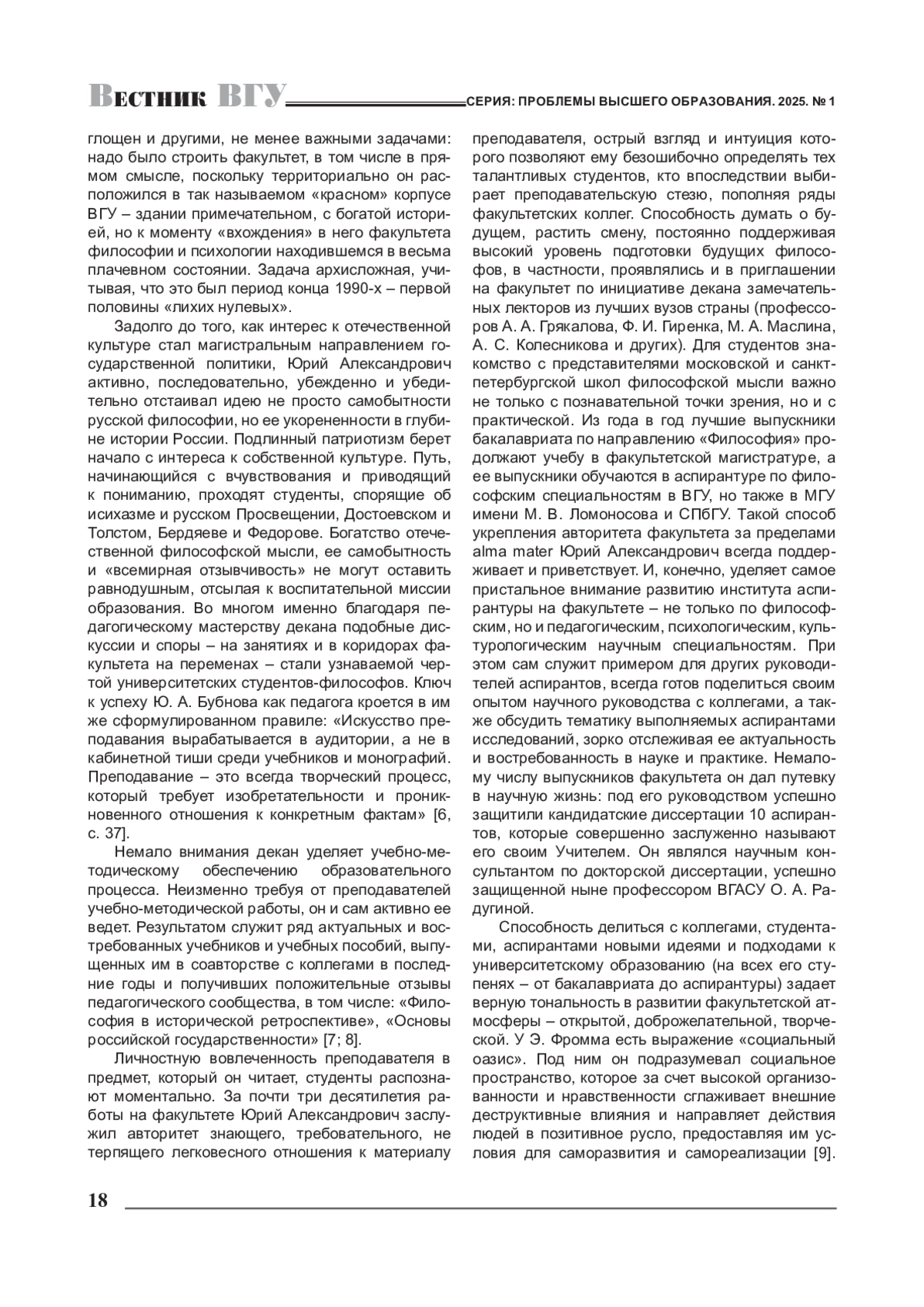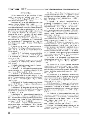 23. Бубнов Ю. А. Общекультурные основания формирования российской идентичности у студенческой молодежи / Ю. А. Бубнов, К. М. Гайдар // Вестник Воронежского государственного университета. Серия: Проблемы высшего образования. - 2024. -№ 4. - С. 5-9. EDN: HBHBZB