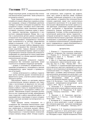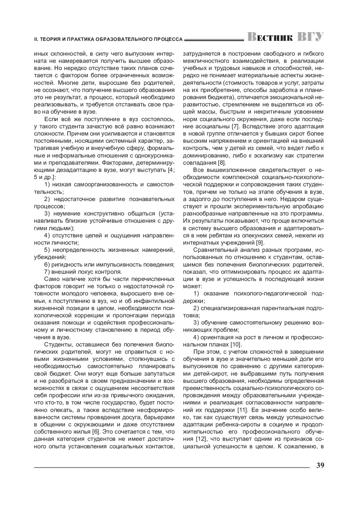 7. Ермакова Л. В. Социально-психологические проблемы студентов из числа детей-сирот и детей, оставшихся без попечения родителей / Л. В. Ермакова // Молодежь и наука: сборник материалов VII Всероссийской научно-технической конференции студентов, аспирантов и молодых ученых, посвященной 50-летию первого полета человека в космос [Электронный ресурс]. - Красноярск: Сибирский федеральный ун-т, 2011. - URL: http://conf.sfu-kras.ru/sites/ mn2011/section10.html (дата обращения: 20.12.2024).