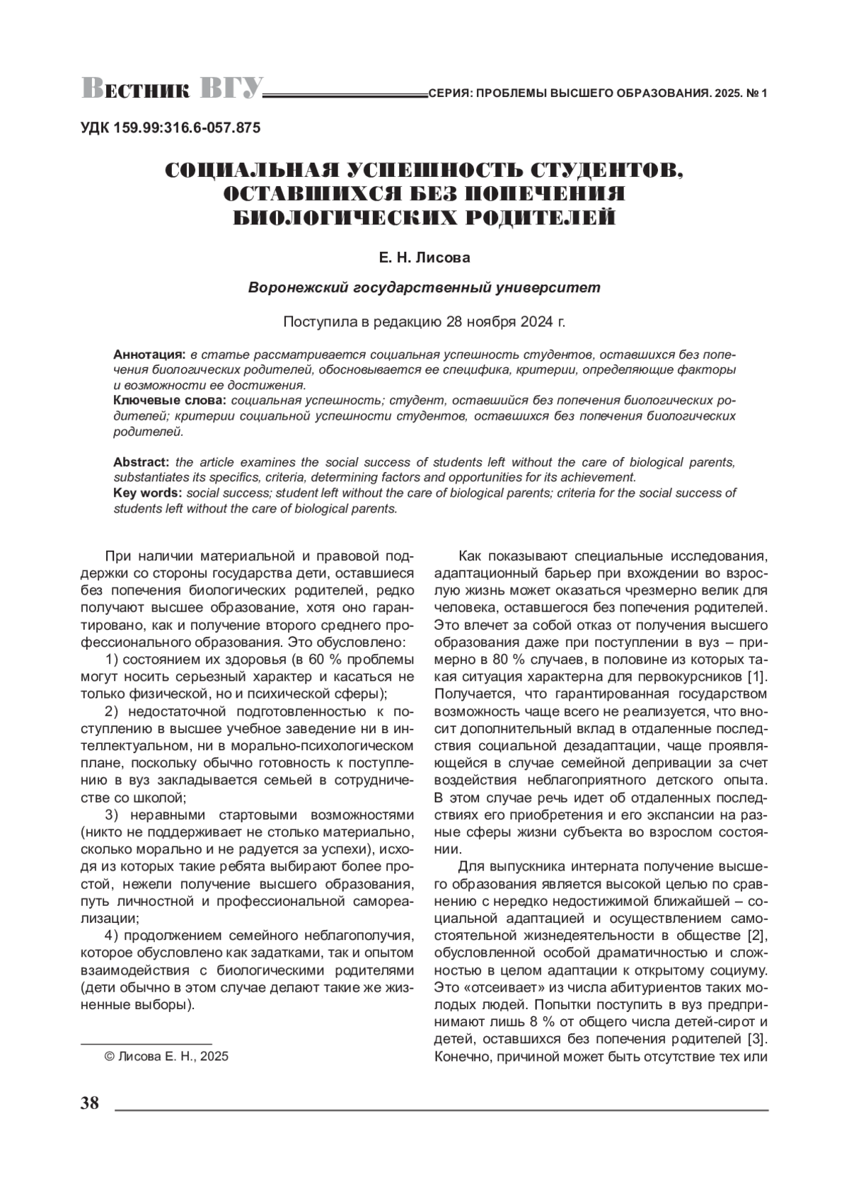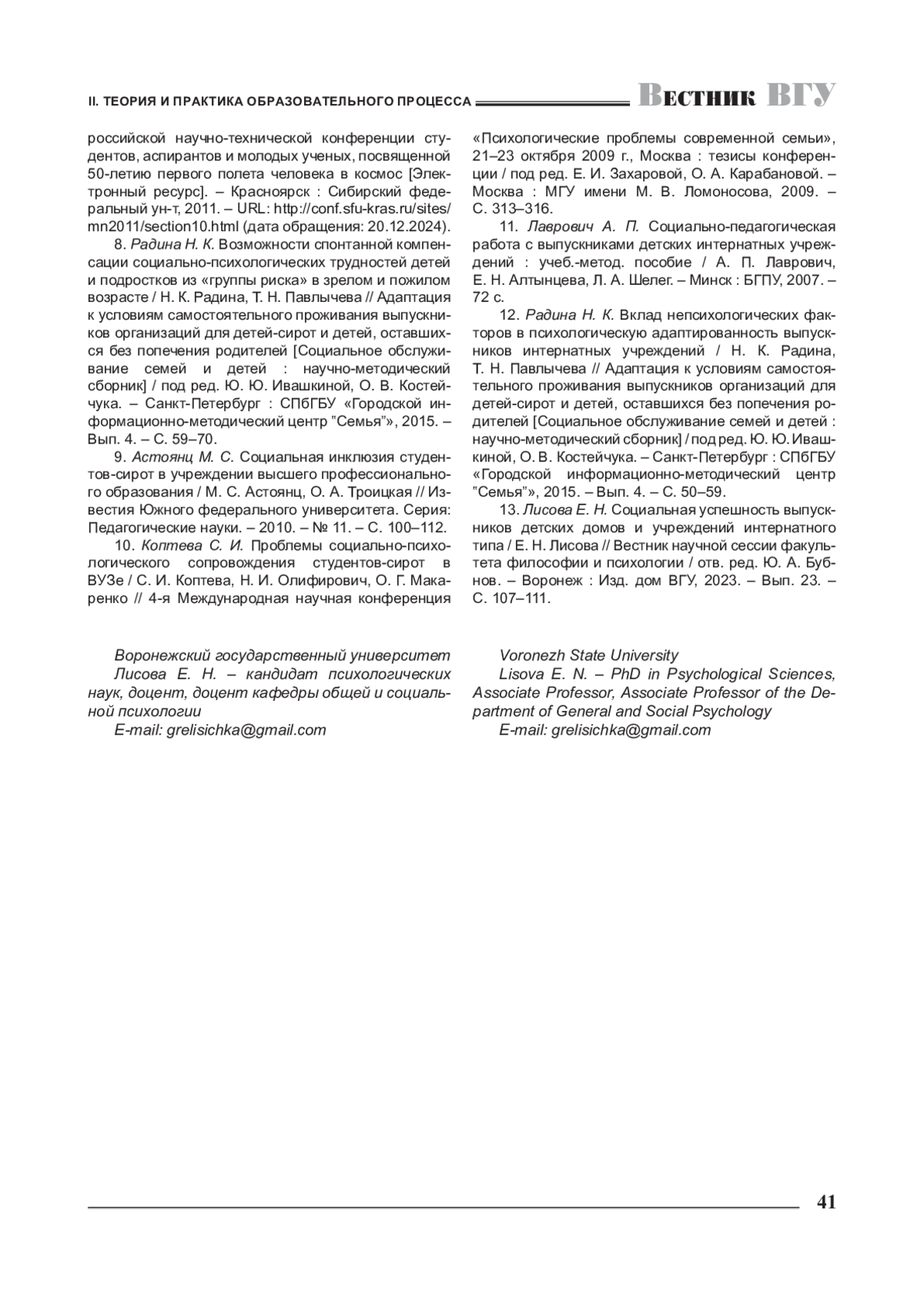 13. Лисова Е. Н. Социальная успешность выпускников детских домов и учреждений интернатного типа / Е. Н. Лисова // Вестник научной сессии факультета философии и психологии / отв. ред. Ю. А. Бубнов. - Воронеж: Изд. дом ВГУ, 2023. - Вып. 23. - С. 107-111. EDN: EGQYYQ