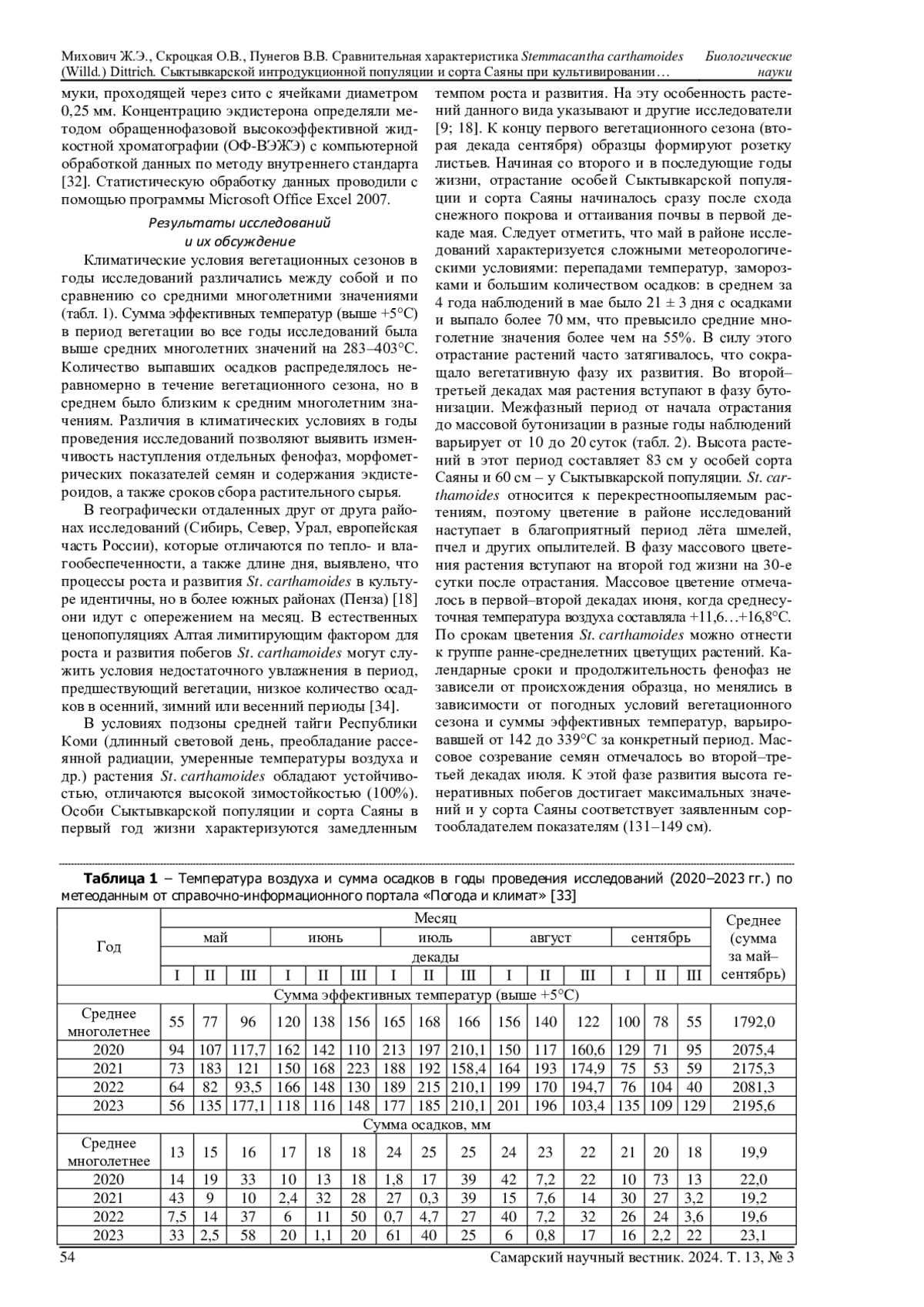Проведена сравнительная оценка биологических и биохимических показателей растений Stemmacantha carthamoides местной репродукции и сорта Саяны, культивируемых в условиях подзоны средней тайги Республики Коми. Показано, что в условиях культуры особи обоих образцов характеризуются высокими показателями жизненности особей, семенной продуктивности, накапливают в надземных и подземных органах достаточное количество экдистерона (не менее 0,1%). Отмечено, что почвенно-климатические условия района интродукции благоприятны для выращивания обоих изучаемых образцов St. carthamoides, и Сыктывкарская популяция может служить основой для создания нового сорта. По содержанию экдистерона в корневищах с корнями и весенних розеточных листьях Сыктывкарская интродукционная популяция не уступает сорту Саяны и превосходит последний по количеству данного вещества в семенах. В неразвернувшихся листьях массовая доля экдистерона составила не менее 0,12 ± 0,01%. Установлено, что максимальное количество экдистероидов находится в зрелых семенах St. carthamoides и их содержание зависит от образца и погодных условий вегетационного сезона (Сыктывкарская популяция - 3,04-4,28%, сорт Саяны - 2,84-2,87%). Обращено внимание на возможность извлечения экдистерона технологически более выгодным путем, используя зрелые семена St. carthamoides. Отмечена проблема ежегодного получения доброкачественных семян данного вида - защита урожая семян от склевывания вьюрками.