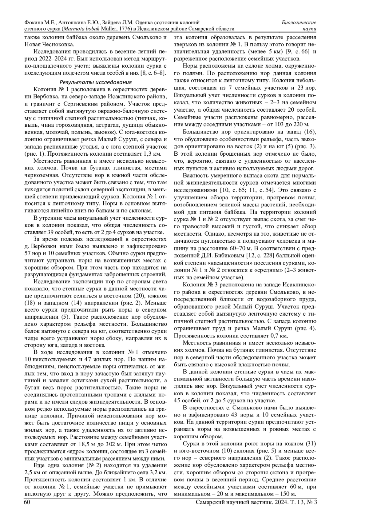 ФОКИНА М. Е., АНТОШКИНА Е. Ю., ЗАЙЦЕВА Л. М. ОЦЕНКА СОСТОЯНИЯ КОЛОНИЙ СТЕПНОГО СУРКА (MARMOTA BOBAK MÜLLER, 1776) В ИСАКЛИНСКОМ РАЙОНЕ САМАРСКОЙ ОБЛАСТИ // САМАРСКИЙ НАУЧНЫЙ ВЕСТНИК. 2024. ТОМ 13, № 3