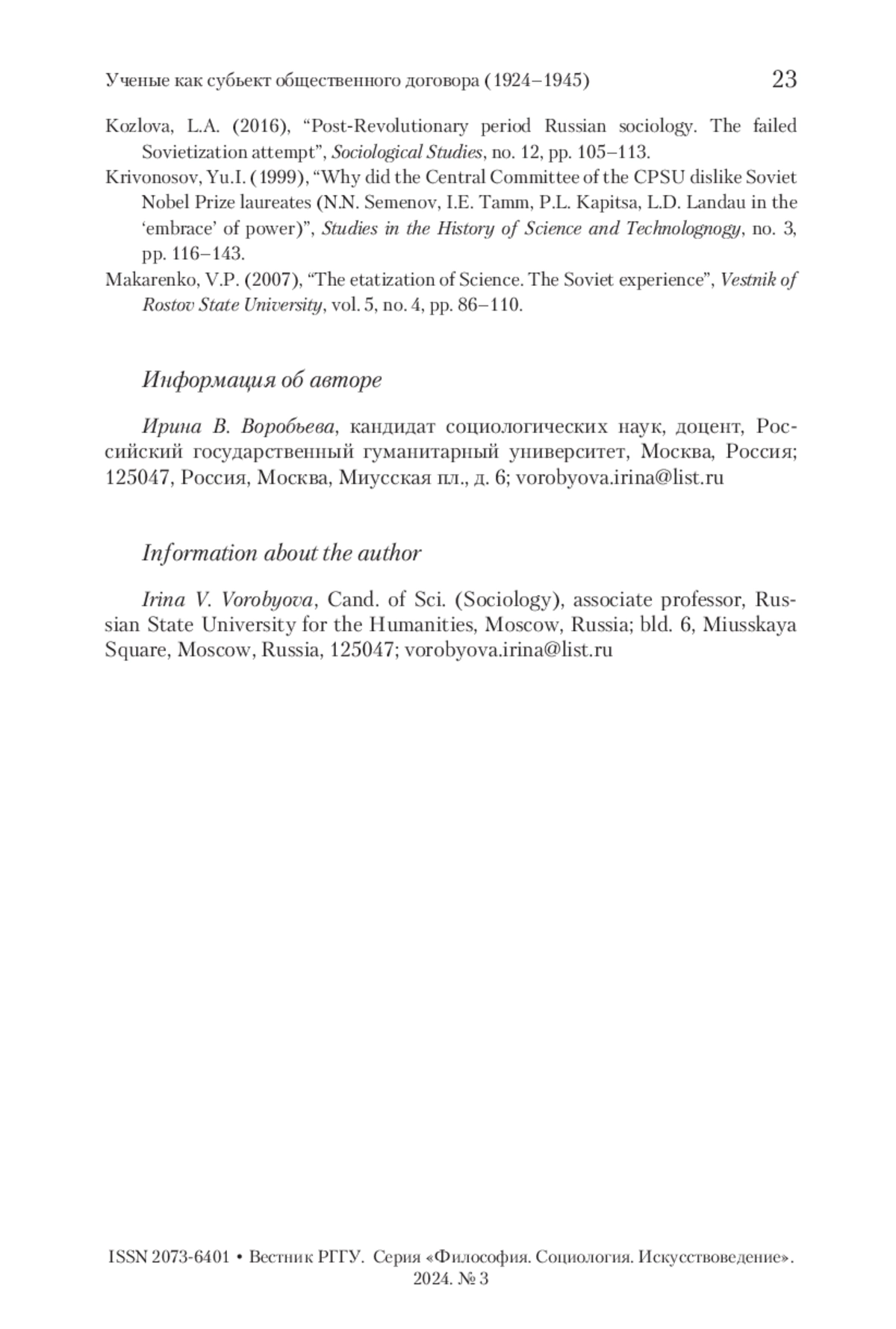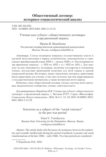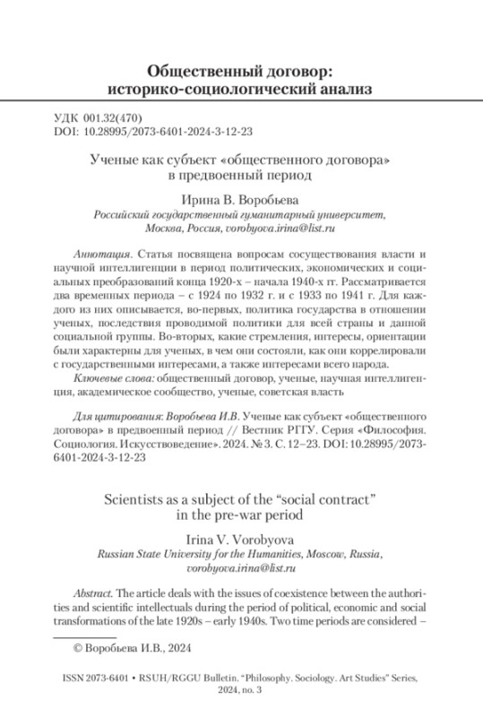 ВОРОБЬЕВА И. В. УЧЕНЫЕ КАК СУБЪЕКТ «ОБЩЕСТВЕННОГО ДОГОВОРА» В ПРЕДВОЕННЫЙ ПЕРИОД // ВЕСТНИК РГГУ. СЕРИЯ: ФИЛОСОФИЯ. СОЦИОЛОГИЯ. ИСКУССТВОВЕДЕНИЕ. 2024. № 3