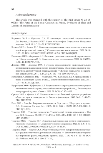 2. Волков 2022 - Волков Ю.Г. Социальная справедливость как ценность: в поисках новой теоретической оптики // Социологические исследования. 2022. № 10. С. 27-36. https://doi.org/10.31857/S013216250021512-6. EDN WGLQOM.