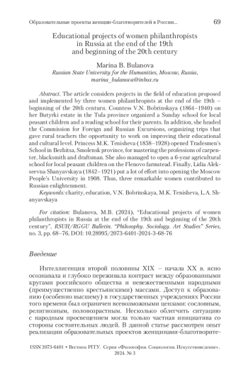 В статье рассматриваются проекты в области образования, предложенные и реализованные тремя женщинами-благотворителями в конце XIX – начале XX в. Графиня В. Н. Бобринская (1864–1940) в своем имении Бутырки Тульской губернии организовала для местных крестьянских детей воскресную школу, а для их родителей – школу обучения чтению. Кроме того, она возглавила Комиссию заграничных и русских экскурсий, устроив поездки, благодаря которым сельские учителя получили возможность поработать над повышением своего образовательного и культурного уровня. Княгиня М. К. Тенишева (1858–1928) открыла в Бежице Смоленской губернии Школу ремесленных учеников, осваивающих профессии столяра, кузнеца, чертежника. Также ей удалось открыть на хуторе Флёново 6-летнюю сельскохозяйственную школу для местных крестьянских детей. Наконец, Лидия Алексеевна Шанявская (1842–1921) приложила немало сил для открытия в 1908 г. Московского народного университета. Тем самым эти образованные, достойные женщины внесли посильный вклад в развитие российского народного образования.