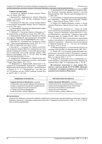 14. Андреев К.М., Кудашов А.С., Сомов А.В. Комплексы неолитической керамики, орнаментированной наколами, Среднего Поволжья, Камско-Вятского и Сурско-Мокшанского междуречий // Вопросы археологии Поволжья. Вып. 10. Самара: СГСПУ, 2023. С. 85-99. EDN: VXHAPW