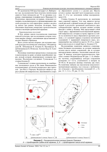 В статье обобщены сведения о поселениях камской неолитической культуры, расположенных на границе двух природных зон - леса и лесостепи (Нижнее Прикамье). Исследованные памятники являются стационарными базовыми поселениями, на которых выявлены остатки шести жилых сооружений полуземляночного типа. Количество выявленных сосудов на поселениях варьирует от 3-4 (Кабы-Копры) до 311 экземпляров (Дубовогривская II). При этом на Дубовогривской II стоянке отмечены материалы как раннего, так развитого и позднего этапов. Наиболее показательны в этом плане стоянки Обсерваторская III (8 сосудов камской культуры раннего этапа) и Лебединская II (36 сосудов развитого этапа). Картография ранненеолитических комплексов камской культуры показывает широкую географию становления этой традиции: Среднее Прикамье (Мокино, Усть-Букорок), Нижнее Прикамье (Зиарат, Дубовогривская II, Муллинское II), Свияга (Кабы-Копры), Вятка (Тархан I, Усть-Шижма I) и Европейский Северо-Восток (Пезмог IV). Муллинское II поселение при этом выделяется среди памятников этого периода обилием керамической посуды, количество которой не характерно для ранненеолитического этапа. Керамика ранненеолитического этапа (А) поселений камской культуры подразделяется на типы (А1-3); керамика развитого этапа (В) в целом по своим показателям и содержанию идентична на всей территории распространения этой керамической традиции; на керамике позднего этапа (С) начинают прослеживаться инокультурные влияния, выраженные в появлении группы сосудов русско-азибейского (С2) и единичной посуды чернашкинского (С3) типов.