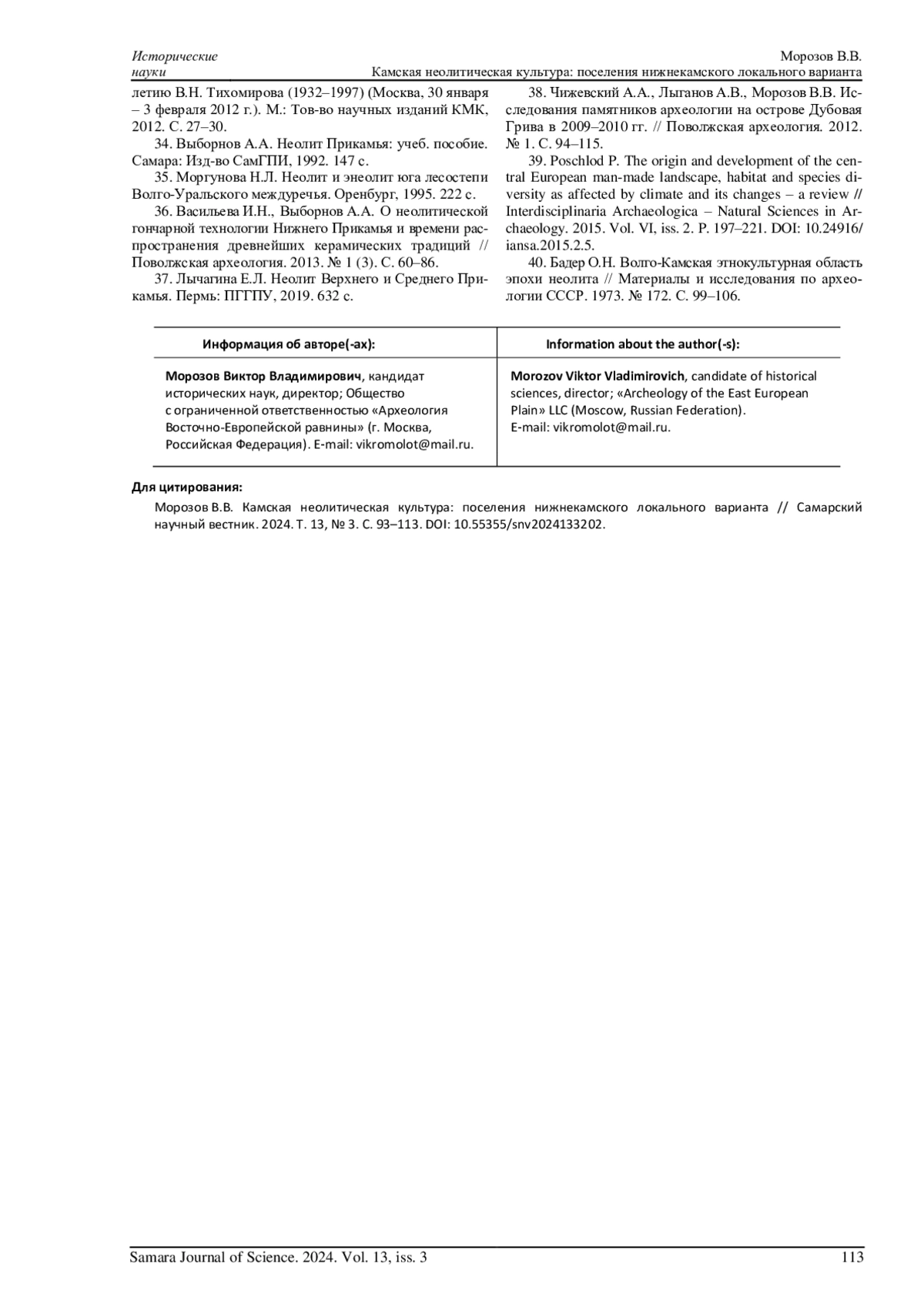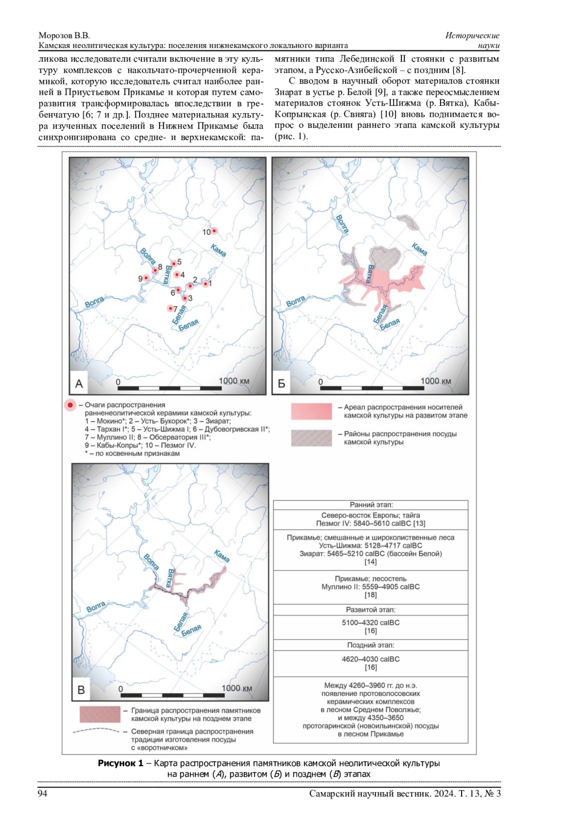 22. Карманов В.Н. Камская неолитическая культура на северо-востоке Европы // Известия Самарского научного центра Российской академии наук. Исторические науки. 2020. Т. 2, № 3 (7). С. 70-83. DOI: 10.37313/2658-4816-2020-2-3-70-83 EDN: TVHZKZ