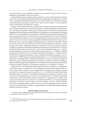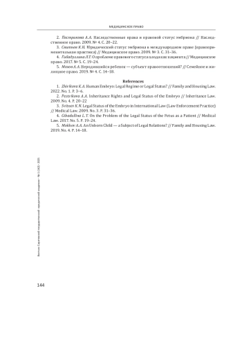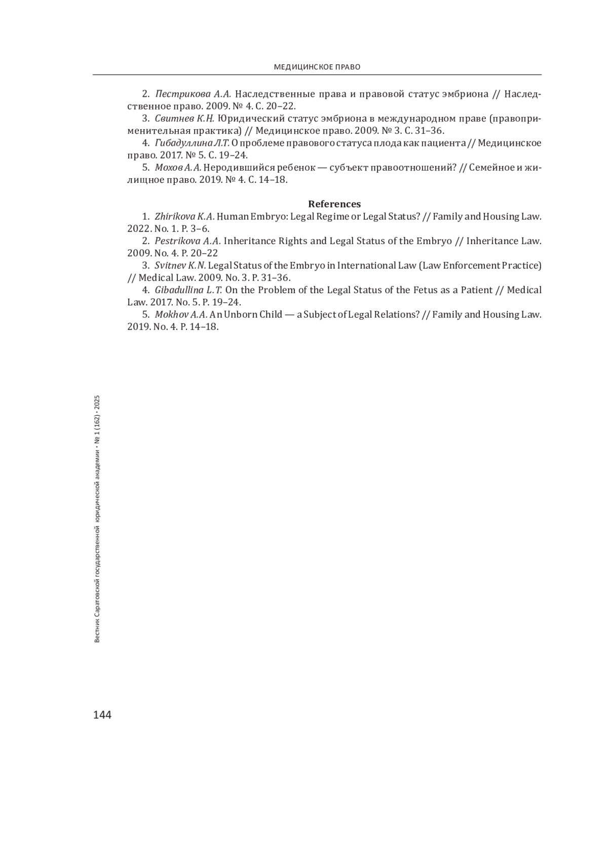 СТРИЖАК М. С. ЭМБРИОН КАК СУБЪЕКТ ПРАВА // ВЕСТНИК САРАТОВСКОЙ ГОСУДАРСТВЕННОЙ ЮРИДИЧЕСКОЙ АКАДЕМИИ. 2025. № 1 (162)