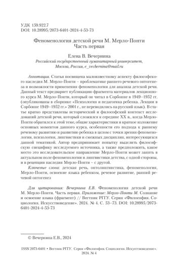 Статья посвящена малоизвестному аспекту философского наследия М. Мерло-Понти – проблематике раннего речевого онтогенеза и возможности применения феноменологии для анализа детской речи. Данный текст предваряет публикацию фрагмента материалов лекционного курса М. Мерло-Понти, который он читал в Сорбонне в 1949–1952 гг. (опубликованы в сборнике «Психология и педагогика ребенка. Лекции в Сорбонне 1949–1952 гг.» 2001 г., не переводились на русский язык). В статье кратко представлены исторический и философский контекст исследований детской речи, который сложился к середине XX в., когда Мерло-Понти обратился к этой теме, общие характеристики и краткое изложение основных моментов данного курса, особенности его подхода к раннему речевому развитию и развитию ребенка в целом с точки зрения феноменологии, психологии, лингвистики и смежных дисциплин, интересующихся данной тематикой. Автор предпринимает попытку выделить философскую специфику исследуемого источника, а также предположить, какое место это исследовательское направление Мерло-Понти может занять в актуальном поле феноменологии и лингвистики детства, с одной стороны, и в рецепции наследия Мерло-Понти – с другой.