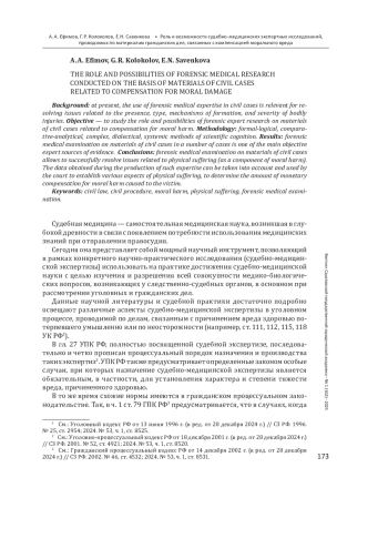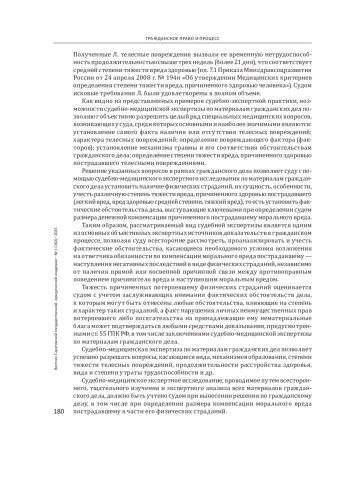 Введение: в настоящее время использование возможностей судебно-медицинской экспертизы по материалам гражданских дел является актуальным для разрешения вопросов, касающихся наличия, вида, механизмов образования, степени тяжести телесных повреждений. Цель - изучить роль и возможности судебно-медицинских экспертных исследований по материалам гражданских дел, связанных с компенсацией морального вреда.