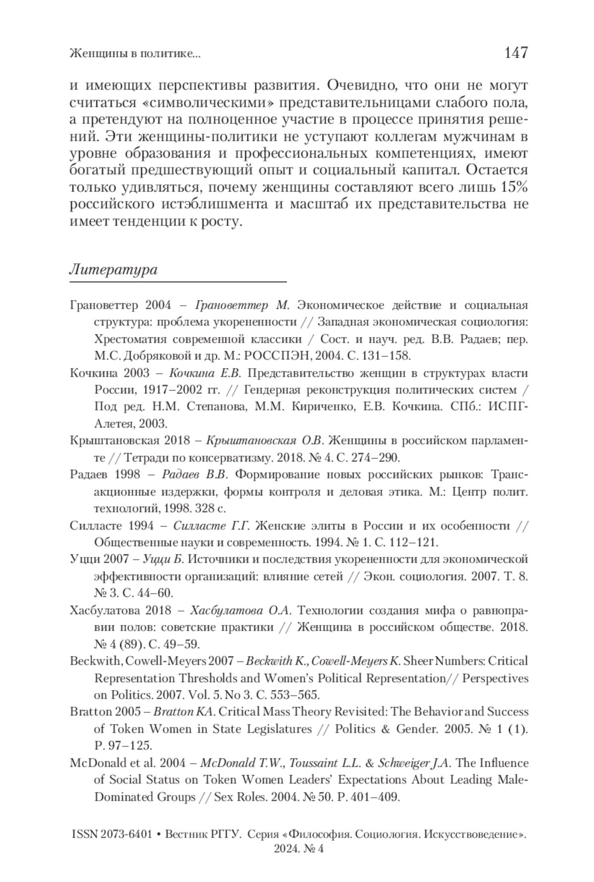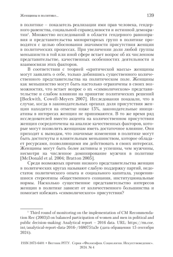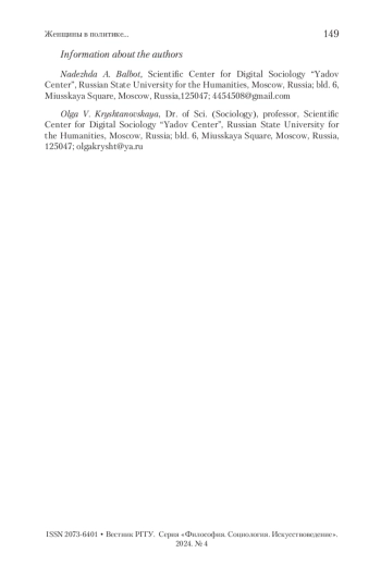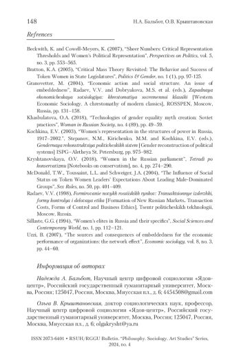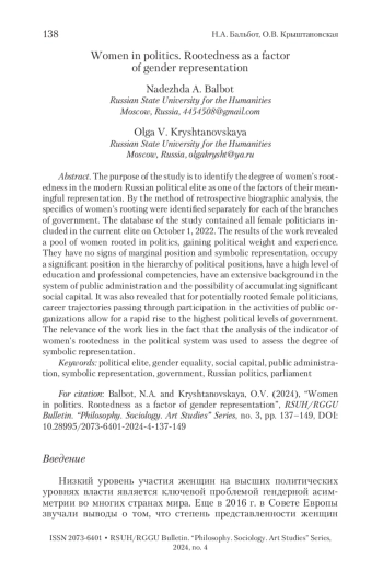 БАЛЬБОТ Н. А., КРЫШТАНОВСКАЯ О. В. ЖЕНЩИНЫ В ПОЛИТИКЕ: УКОРЕНЕННОСТЬ КАК ФАКТОР ГЕНДЕРНОГО ПРЕДСТАВИТЕЛЬСТВА // ВЕСТНИК РГГУ. СЕРИЯ: ФИЛОСОФИЯ. СОЦИОЛОГИЯ. ИСКУССТВОВЕДЕНИЕ. 2024. № 4