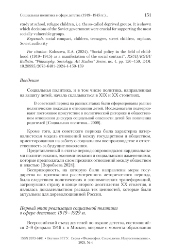Статья посвящена вопросам реализации социальной политики в сфере детства в период политических, экономических и социальных преобразований российского общества с 1919 до 1945 г. В ходе анализа рассмотрены два временных периода – с 1919 по 1929 г. и с 1930 по 1945 г. Основные группы детей, на которых была направлена социальная политика государства в рассматриваемый период, включала беспризорников, сирот, детей, лишенных возможности учиться в школе, детей-беженцев, т. е. так называемые депривированные группы. Показано, какие решения советской власти имели решающее значение для поддержки наиболее социально незащищенных групп.