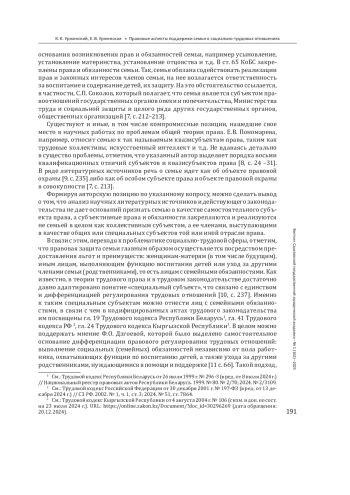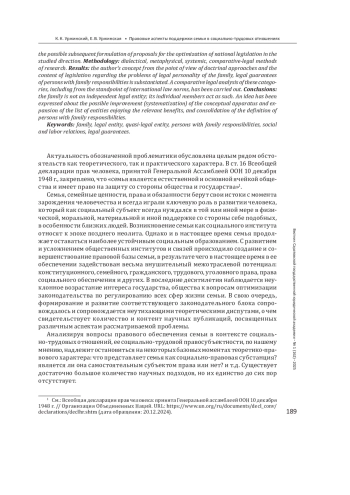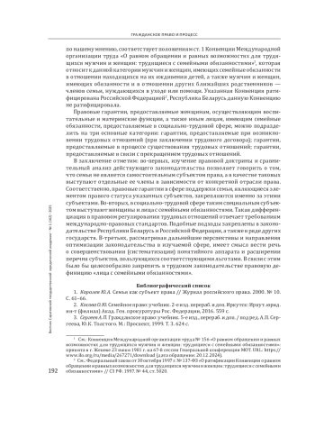 Введение: в основополагающих актах международного права семья позиционируется как первичная ячейка человеческого общества, поскольку играет первостепенную, основополагающую роль во всех сферах общественной жизни. Принцип государственной защиты семьи является одним из фундаментальных межотраслевых принципов. В связи с этим значительный научный и практический интерес представляет исследование как общих вопросов правосубъектности семьи, так и более узконаправленной проблематики правовых гарантий в конкретно отраслевом контексте, в частности в социально-трудовой сфере. Цель - провести научный анализ некоторых аспектов правового статуса семьи, лиц с семейными обязанностями с возможным последующим формулированием предложений по оптимизации национального законодательства в исследуемом направлении.