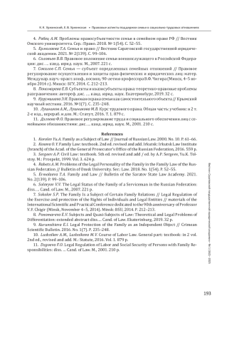 1. Королев Ю. А. Семья как субъект права // Журнал российского права. 2000. № 10. С. 61-66.