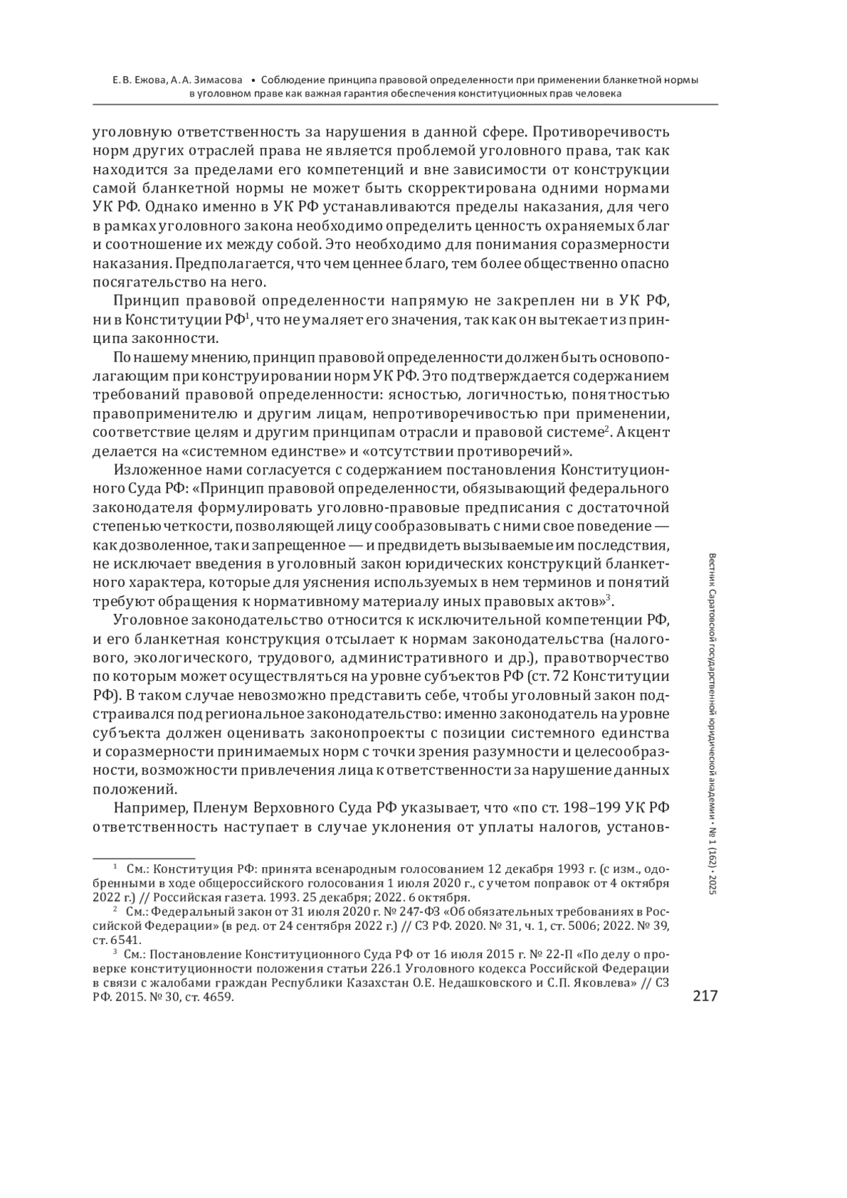 ЕЖОВА Е. В., ЗИМАСОВА А. А. СОБЛЮДЕНИЕ ПРИНЦИПА ПРАВОВОЙ ОПРЕДЕЛЕННОСТИ ПРИ ПРИМЕНЕНИИ БЛАНКЕТНОЙ НОРМЫ В УГОЛОВНОМ ПРАВЕ КАК ВАЖНАЯ ГАРАНТИЯ ОБЕСПЕЧЕНИЯ КОНСТИТУЦИОННЫХ ПРАВ ЧЕЛОВЕКА // ВЕСТНИК САРАТОВСКОЙ ГОСУДАРСТВЕННОЙ ЮРИДИЧЕСКОЙ АКАДЕМИИ. 2025. № 1 (162)