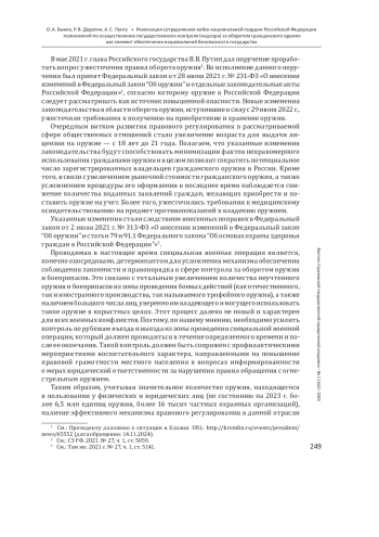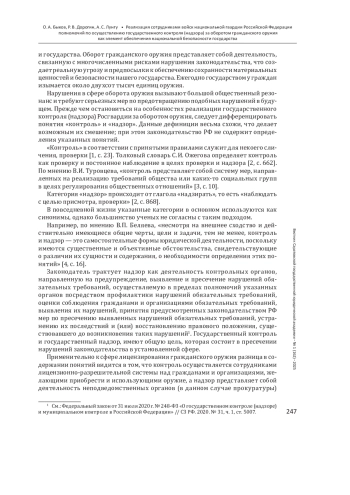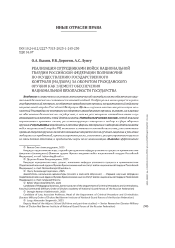 БЫКОВ О. А., ДОРОГИН Р. В., ЛУНГУ А. С. РЕАЛИЗАЦИЯ СОТРУДНИКАМИ ВОЙСК НАЦИОНАЛЬНОЙ ГВАРДИИ РОССИЙСКОЙ ФЕДЕРАЦИИ ПОЛНОМОЧИЙ ПО ОСУЩЕСТВЛЕНИЮ ГОСУДАРСТВЕННОГО КОНТРОЛЯ (НАДЗОРА) ЗА ОБОРОТОМ ГРАЖДАНСКОГО ОРУЖИЯ КАК ЭЛЕМЕНТ ОБЕСПЕЧЕНИЯ НАЦИОНАЛЬНОЙ БЕЗОПАСНОСТИ ГОСУДАРСТВА // ВЕСТНИК САРАТОВСКОЙ ГОСУДАРСТВЕННОЙ ЮРИДИЧЕСКОЙ АКАДЕМИИ. 2025. № 1 (162)