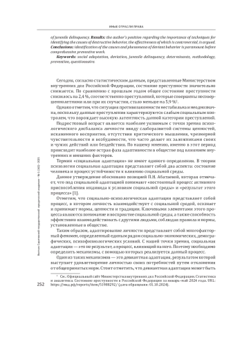 Методологическая основа: анализ категорий «социальная адаптация» и «девиантное поведение», совокупность сравнительно-правового и формально-юридического методов для процесса познания психологической и правовой материи, ее феноменологии, то есть выявления и разрешения проблем, возникающих при реализации подходов к выявлению причин и явлений подростковой преступности.