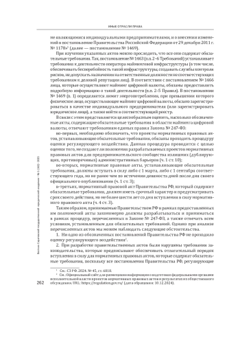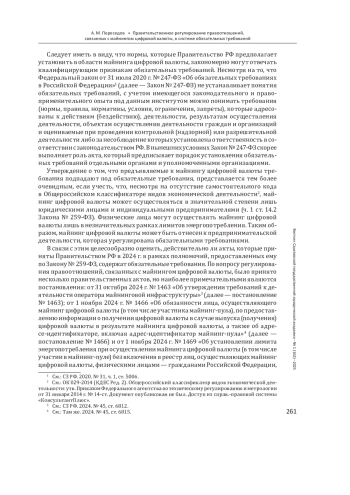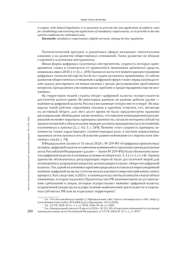 Введение: актуальность темы исследования обусловлена проведенной в 2024 г. реформой, направленной на регулирование оборота цифровой валюты, в том числе ее майнинга. Данное регулирование сопровождалось введением новых обязательных требований, предъявляемых к деятельности хозяйствующих субъектов. Цель - изучить, насколько обязательные требования в области майнинга цифровой валюты соответствуют порядку их разработки и принятия, который установлен в Федеральном законе от 31 июля 2020 г. № 247-ФЗ «Об обязательных требованиях в Российской Федерации».