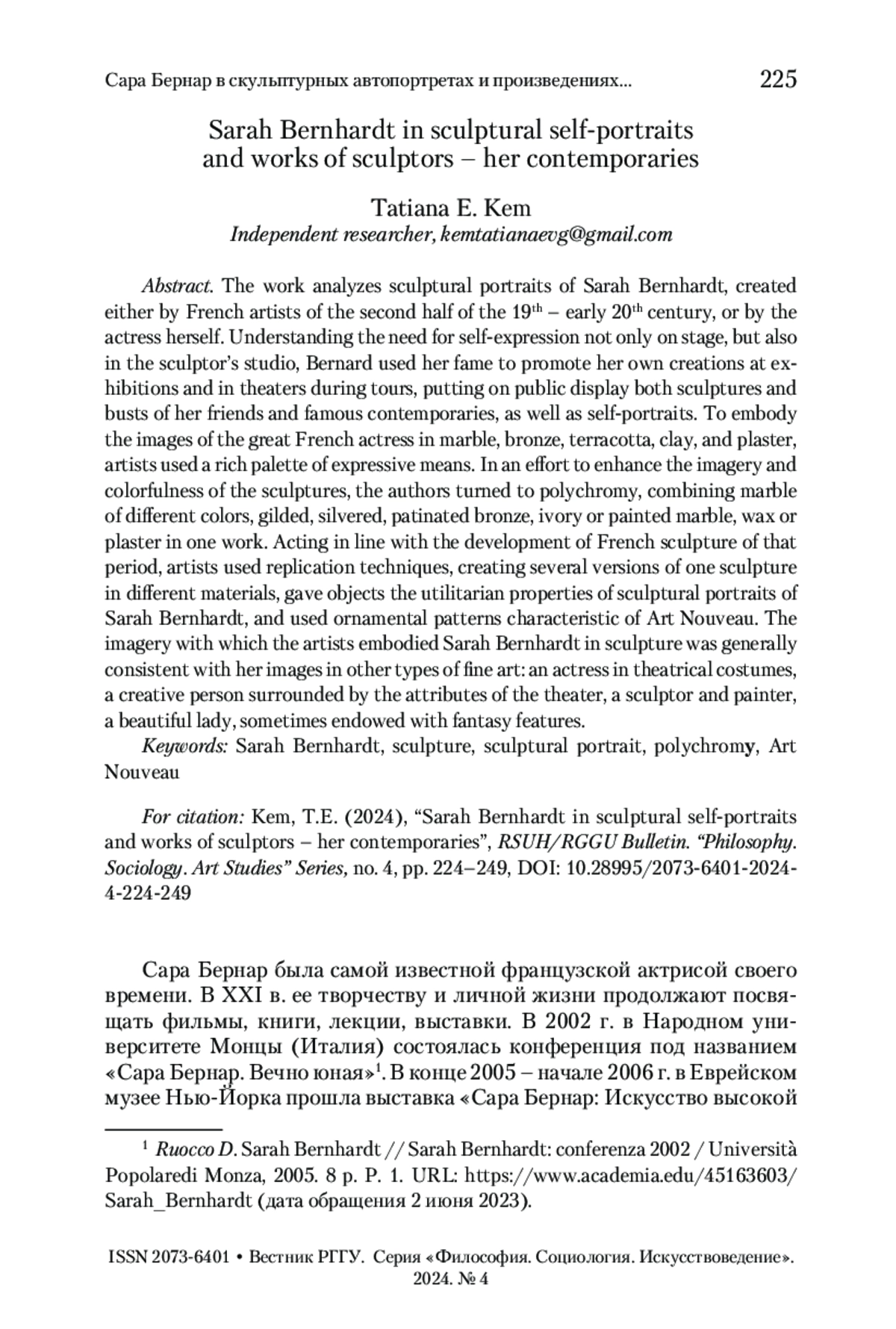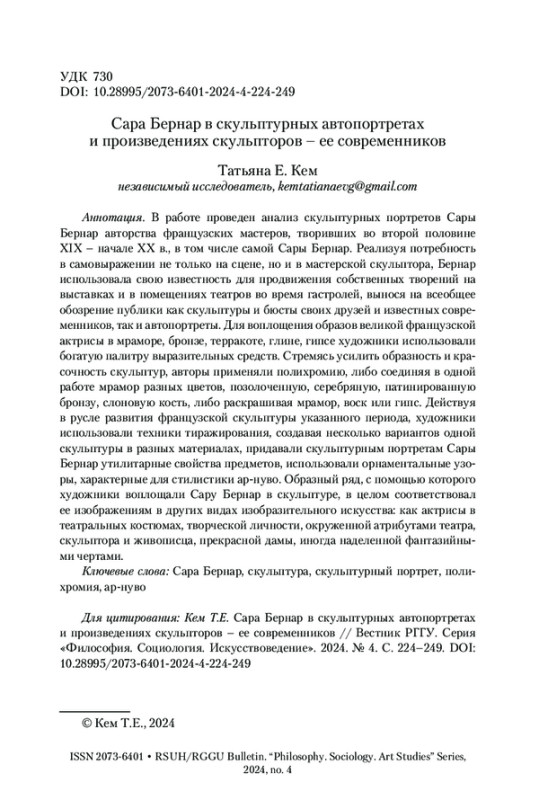 В работе проведен анализ скульптурных портретов Сары Бернар авторства французских мастеров, творивших во второй половине XIX – начале ХХ в., в том числе самой Сары Бернар. Реализуя потребность в самовыражении не только на сцене, но и в мастерской скульптора, Бернар использовала свою известность для продвижения собственных творений на выставках и в помещениях театров во время гастролей, вынося на всеобщее обозрение публики как скульптуры и бюсты своих друзей и известных современников, так и автопортреты. Для воплощения образов великой французской актрисы в мраморе, бронзе, терракоте, глине, гипсе художники использовали богатую палитру выразительных средств. Стремясь усилить образность и красочность скульптур, авторы применяли полихромию, либо соединяя в одной работе мрамор разных цветов, позолоченную, серебряную, патинированную бронзу, слоновую кость, либо раскрашивая мрамор, воск или гипс. Действуя в русле развития французской скульптуры указанного периода, художники использовали техники тиражирования, создавая несколько вариантов одной скульптуры в разных материалах, придавали скульптурным портретам Сары Бернар утилитарные свойства предметов, использовали орнаментальные узоры, характерные для стилистики ар-нуво. Образный ряд, с помощью которого художники воплощали Сару Бернар в скульптуре, в целом соответствовал ее изображениям в других видах изобразительного искусства: как актрисы в театральных костюмах, творческой личности, окруженной атрибутами театра, скульптора и живописца, прекрасной дамы, иногда наделенной фантазийными чертами.