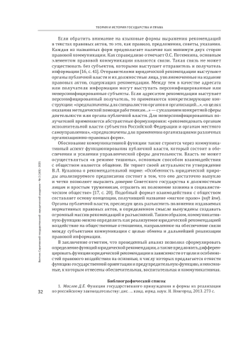 Выводы: под функциями юридической рекомендации предлагается понимать обусловленные социальным назначением и сущностью имманентные направления и виды правового воздействия на волю, сознание и поведение людей, направленные на достижение определенных целей в механизме правового воздействия. К числу основных функций предлагается отнести функцию государственной ориентации и предупредительную функцию. В числе неосновных функций юридической рекомендации автором обосновываются обеспечительная функция, воспитательная функция, коммуникативная функция.