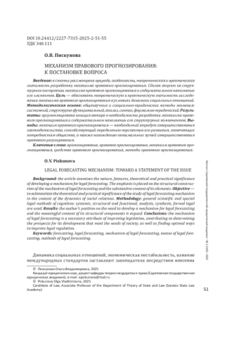 Статья: МЕХАНИЗМ ПРАВОВОГО ПРОГНОЗИРОВАНИЯ: К ПОСТАНОВКЕ ВОПРОСА (2025)