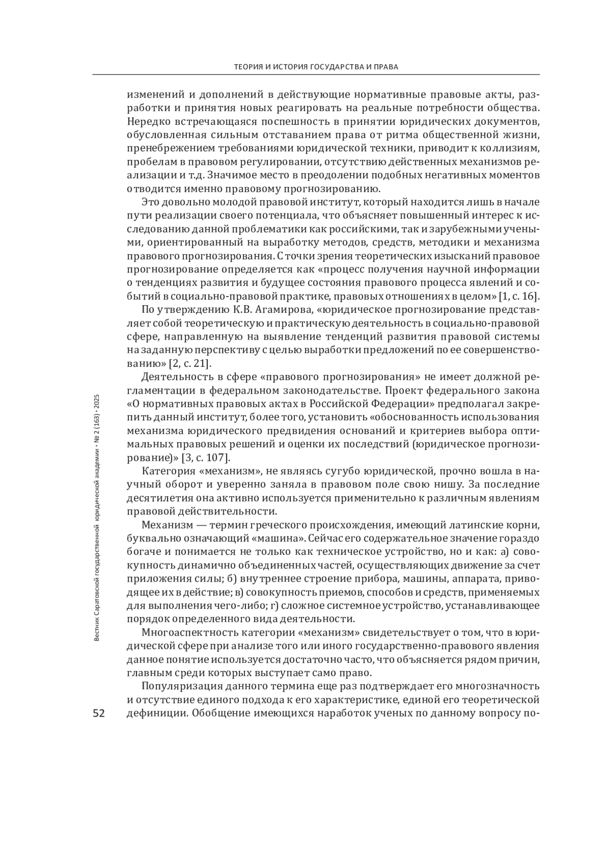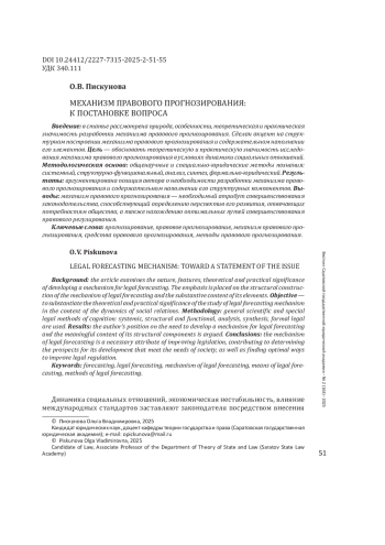 ПИСКУНОВА О. В. МЕХАНИЗМ ПРАВОВОГО ПРОГНОЗИРОВАНИЯ: К ПОСТАНОВКЕ ВОПРОСА // ВЕСТНИК САРАТОВСКОЙ ГОСУДАРСТВЕННОЙ ЮРИДИЧЕСКОЙ АКАДЕМИИ. 2025. № 2 (163)