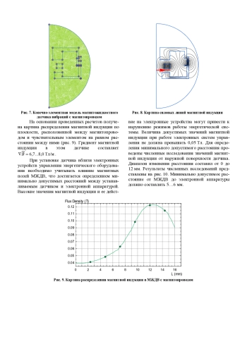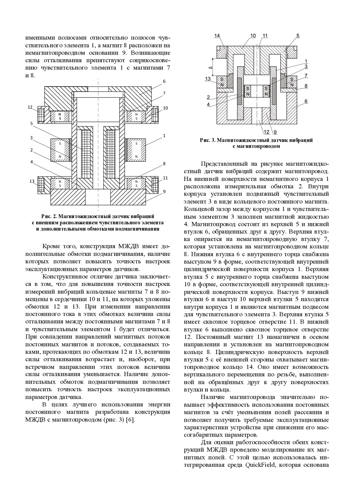 В статье проведён анализ вибраций машиностроительных узлов энергетического оборудования ГРЭС, а именно подшипниковых опор дутьевых вентиляторов и дымососов, для диагностики уровня вибраций которых предложено использовать магнитожидкостные датчики. На основе моделирования магнитного поля в программном комплексе QuickField проведена сравнительная оценка конструкций магнитожидкостных датчиков по эффективности использования постоянных магнитов и электромагнитной совместимости. Получены графики распределения магнитной индукции в предлагаемых конструкциях датчиков.