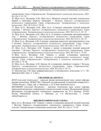 19. Шум Ал.А., Ветошкин А.М. О центрах симметрии выпуклого пространственного тела // Вестник Тверского государственного технического университета. Серия “Строительство. Электротехника и химические технологии”. 2023. № 2 (18). С. 64-72. EDN: AYIWTW