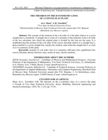 20. Шум Ал.А., Ветошкин А.М. Теорема о центре n-симметрии плоской выпуклой пластины // Вестник Тверского государственного технического университета. Серия “Строительство. Электротехника и химические технологии”. 2023. № 3 (19). С. 75-82. EDN: VCTUBO