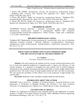 ТРОФИМОВ В. И. ПРИМЕНЕНИЕ ОТХОДОВ ПРОИЗВОДСТВА КОМПОЗИТНЫХ СЕТОК ДЛЯ ИЗГОТОВЛЕНИЯ ДОРОЖНЫХ БЕТОННЫХ ИЗДЕЛИЙ // ВЕСТНИК ТВЕРСКОГО ГОСУДАРСТВЕННОГО ТЕХНИЧЕСКОГО УНИВЕРСИТЕТА. СЕРИЯ: СТРОИТЕЛЬСТВО. ЭЛЕКТРОТЕХНИКА И ХИМИЧЕСКИЕ ТЕХНОЛОГИИ. 2024. № 1 (21)